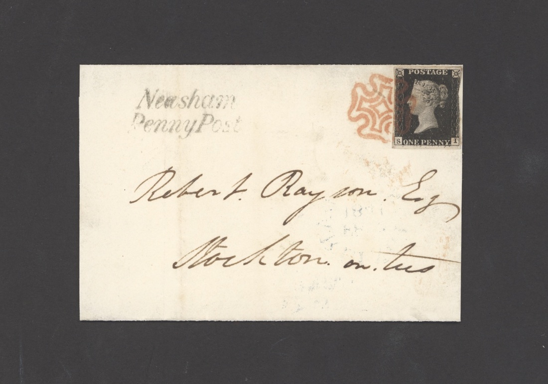 SI, constant variety, an unlisted intense black shade, cut into at right, good to large margins other sides, tied by superb red Maltese Cross cancellation to entire (no side flaps) from Darlington to Stockton on Tees, "Neasham/Penny Post" on the front and Darlington c.d.s. on reverse; parts of flaps neatly replaced. Attractive and scarce