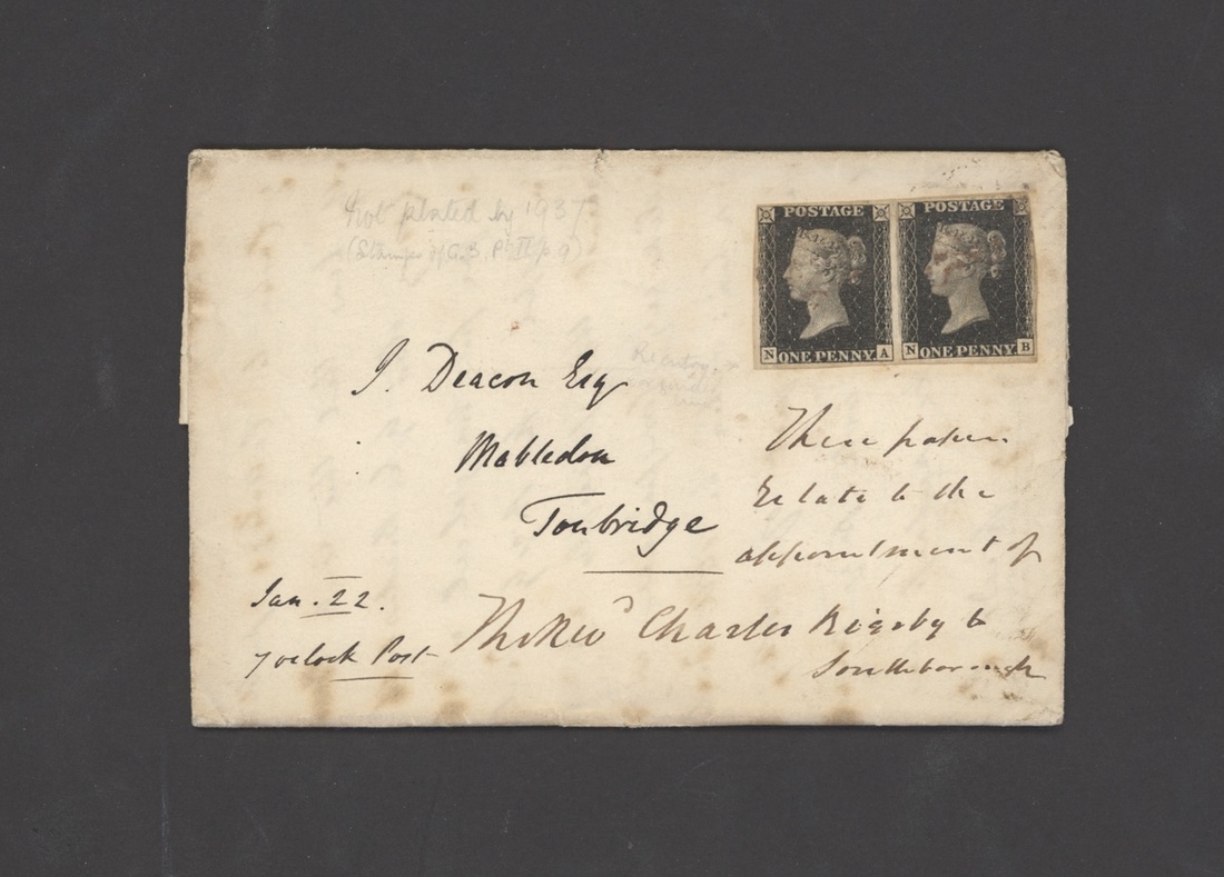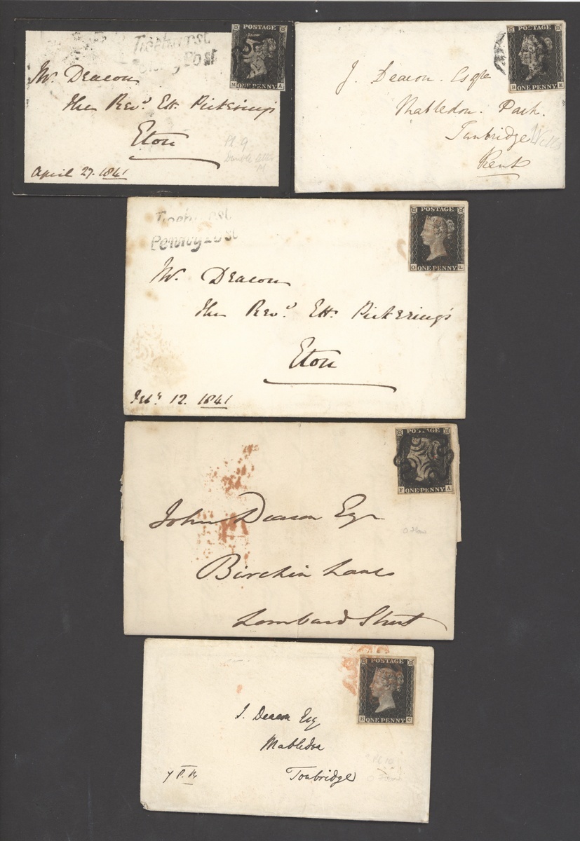 1841 six covers to the same addressee, Mr. J Deacon in Kent, five bearing 1840 1d. black lettered OL, MA, BE, HC and FA respectively, (HC a plate X with a red Maltese Cross), and a sixth bearing 1840 1d. black pair lettered NA-NB, mixed condition