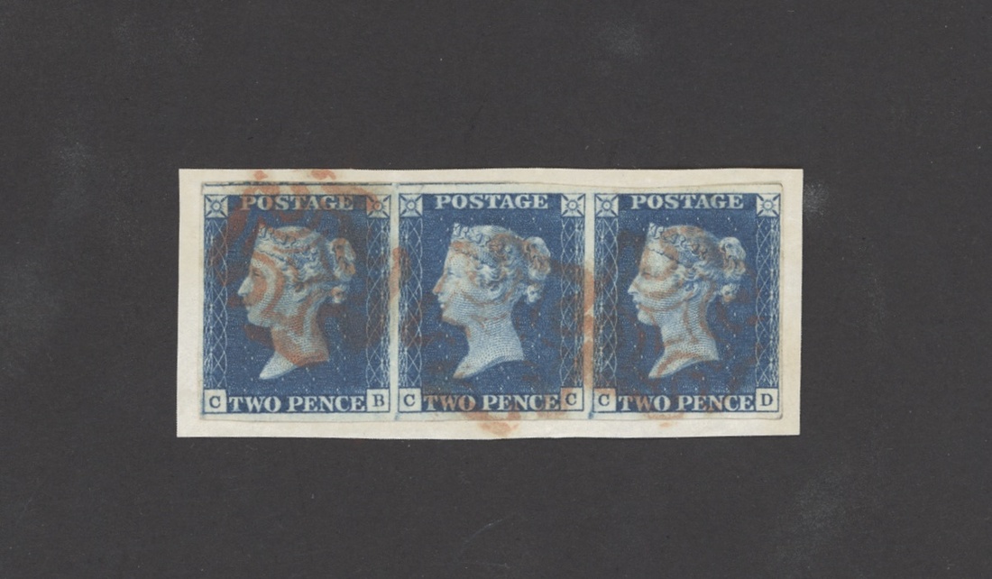 CB-CD horizontal strip of three, large to very large margins all round and showing portions of three adjoining stamps at top, tied to piece by red Maltese Cross cancellations, some minor wrinkling affecting the centre stamp; fine. A beautiful strip and very rare.