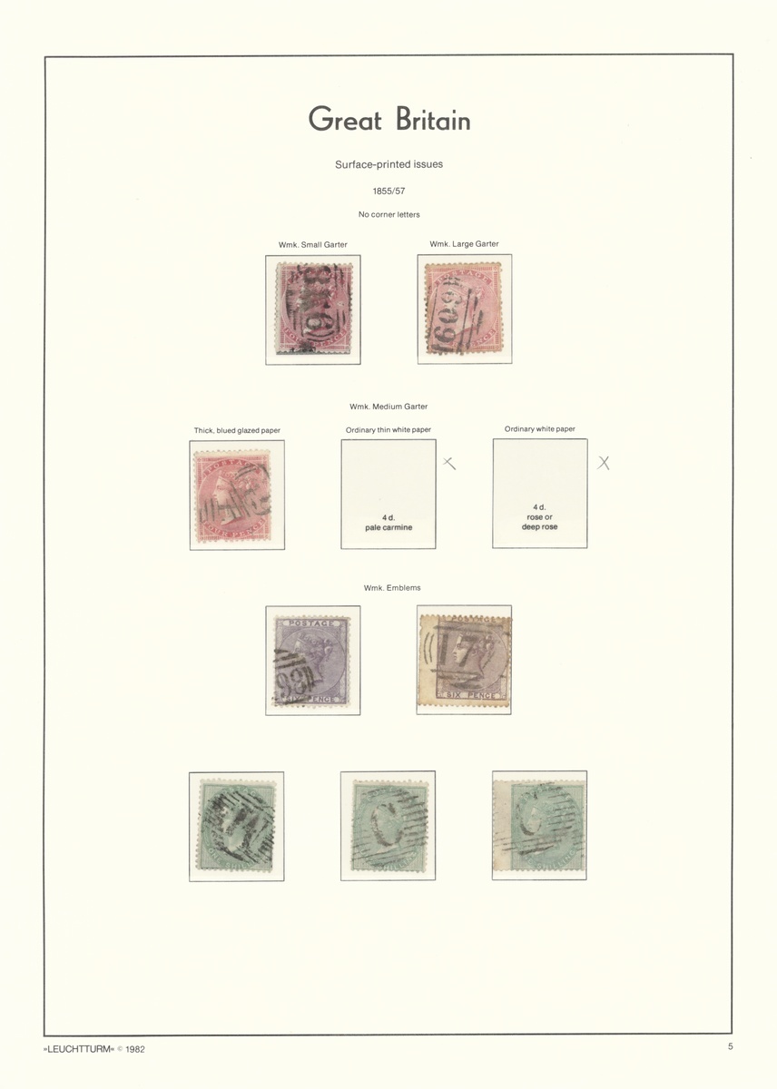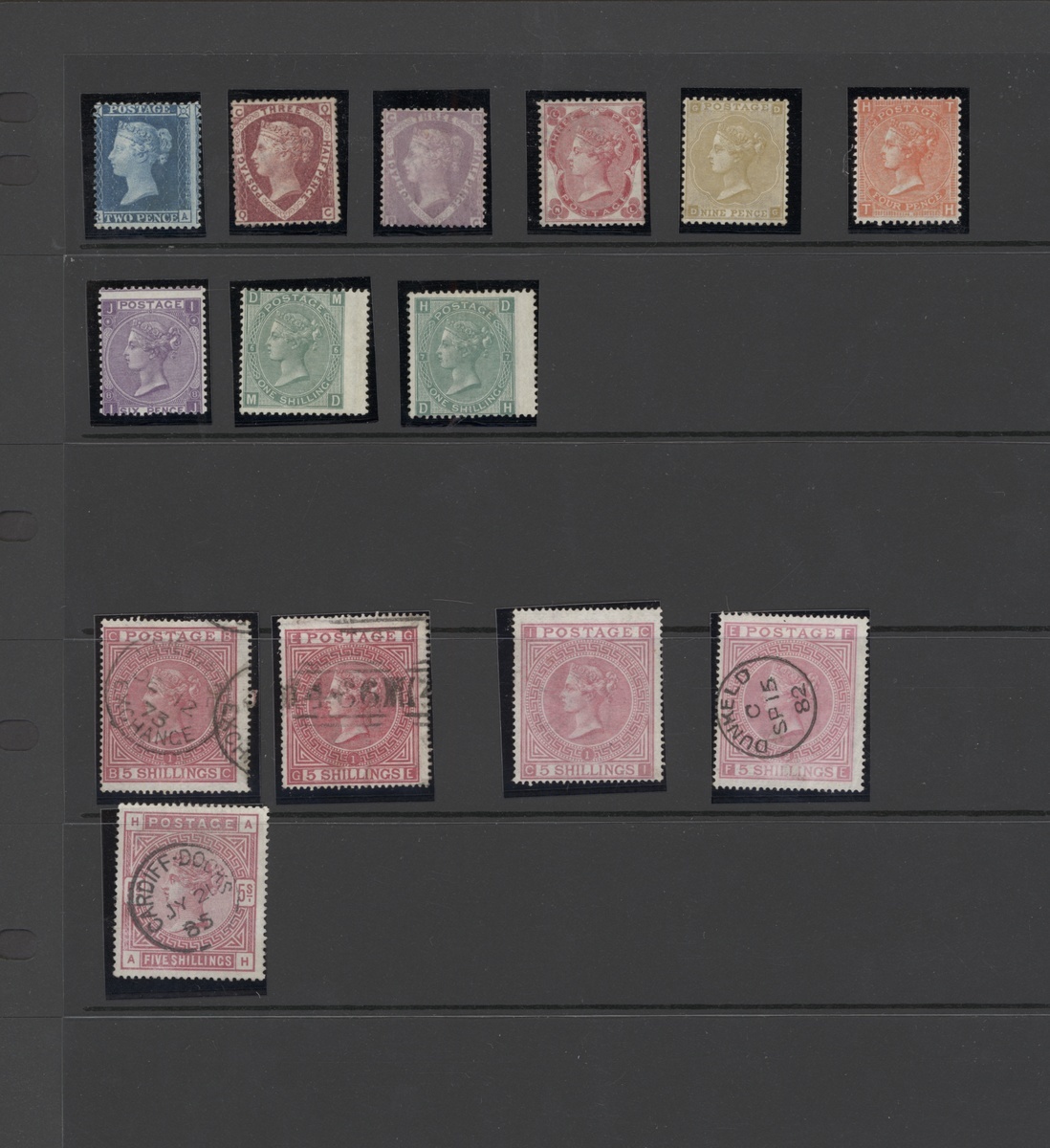 2d. blue, unused without gum; 1870-74 1½d. Plate 1 unused (regummed) and prepared for use but not issued 1½d. rosy mauve with part original gum, reperforated at top; 1855-57 used group comprising 4d. wmk Small and Large (2) Garter, 6d. (2) and 1/- (3); 1862-64 3d. bright carmine, Plate 2, unused without gum, and 9d. straw of good colour, regummed; 1865-67 4d. Plates 11 (2) and 13, 6d. Plates 5 and 6, 9d. and 1/-, all used, and 4d. Plate 12 with part original gum; 1867-80 wmk. Spray 6d. mauve without hyphen, Plate 8, unmounted mint, and 1/- Plates 6 and 7, the former with part original gum, the latter with large part original gum; 1867-73 wmk. Maltese Cross 5/- rose used, one with Liverpool Exchange c.d.s., the other with faults, and 5/- pale rose Plate 1 unused without gum and Plate 2 with neat Dunkeld c.d.s., and 1883-84 5/- rose with central Cardiff Docks c.d.s.; mixed condition