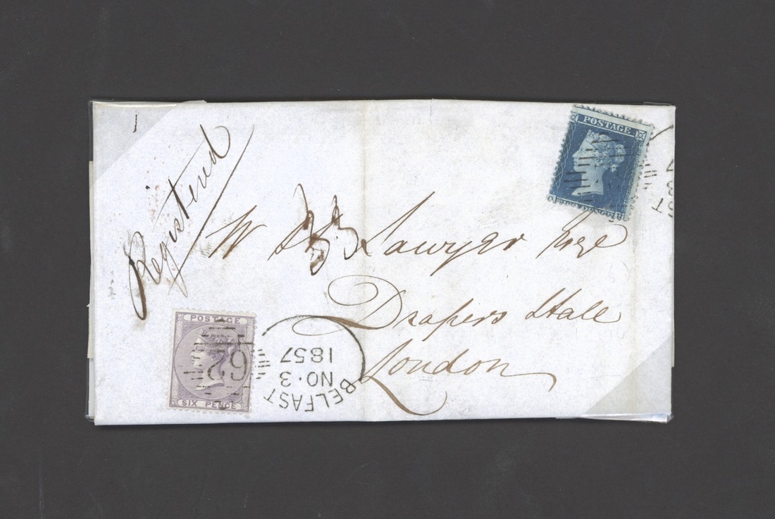 2d. blue, Plate 6: OH, used with 1855-57 6d. on entire letter registered to London, superb Belfast Spoon cancellations, the 2d. with small fault and the entire with vertical filing fold well clear of the adhesives; an attractive and scarce combination