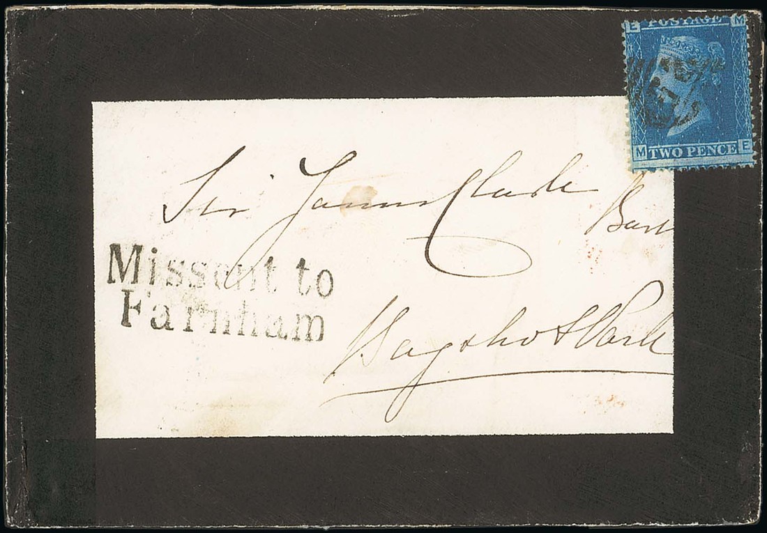 2d. Plate 9: ME tied to mourning envelope dated 23 July 1863, from Cowes Isle of Wight to Bagshot, addressed to Sir James Clarke (physician to Queen Victoria) with "Missent to/Farnham" (only recorded in blue by Willcocks & Jay); superb black Royal seal on the reverse; fine. R.P.S. Certificate (2019). Photo