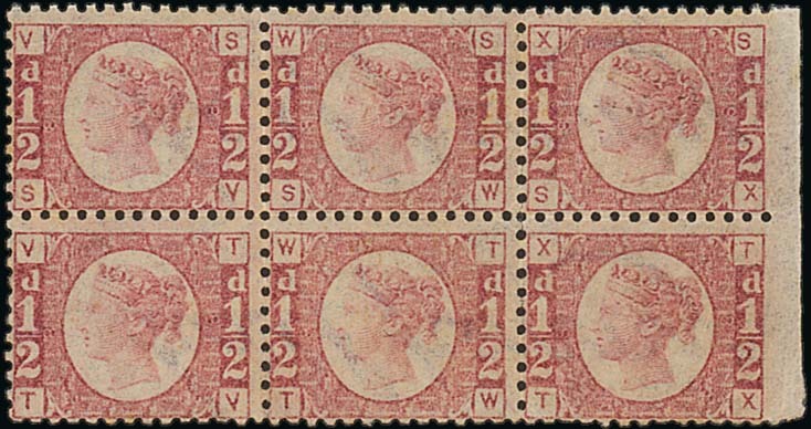 ½d. Plate 8: SV-TX block of six (3x2) from the right of the sheet, imperforate between the stamps and trimmed margin at right, watermark inverted and reversed, unmounted mint; fine. S.G. 8Wk, £2,700++. Photo