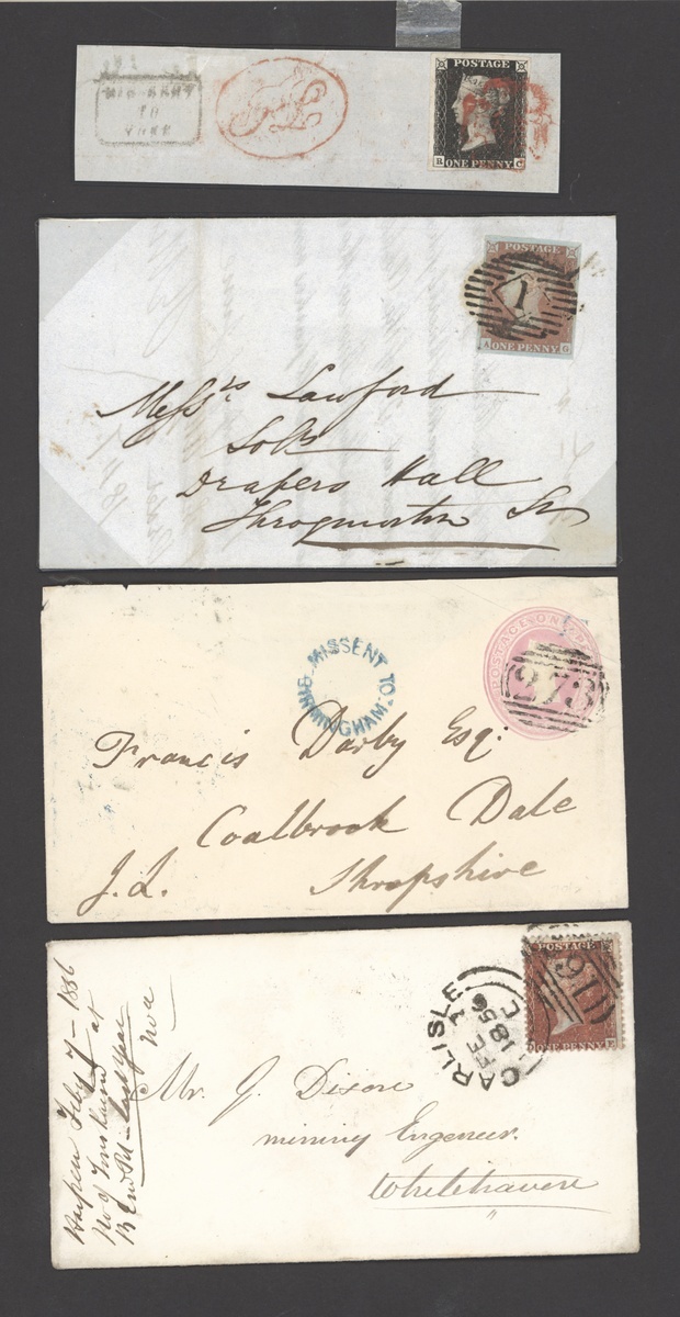 Chiefly line engraved selection, 42 items, including 1840 1d. Black Plate VI on piece with red oval script PL alongside, 1840 2d. Plate 1 with part sheet margin at right, 1841-54 1d. Plate 13 on cover with straight line Boughton alongside, 1d. Plate 74 on cover with London "1" barred oval, 1859 1d. pink envelope and 1850 cover each with Missent to/Birmingham, 1854 entire franked 1d. (3) with red