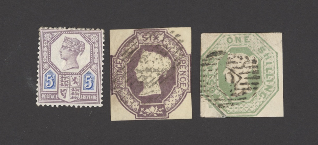 1/- green and 6d. purple, used, cut square, touched at places and the 1/- with some embossing splits, also 1887-92 5d. Die I part original gum