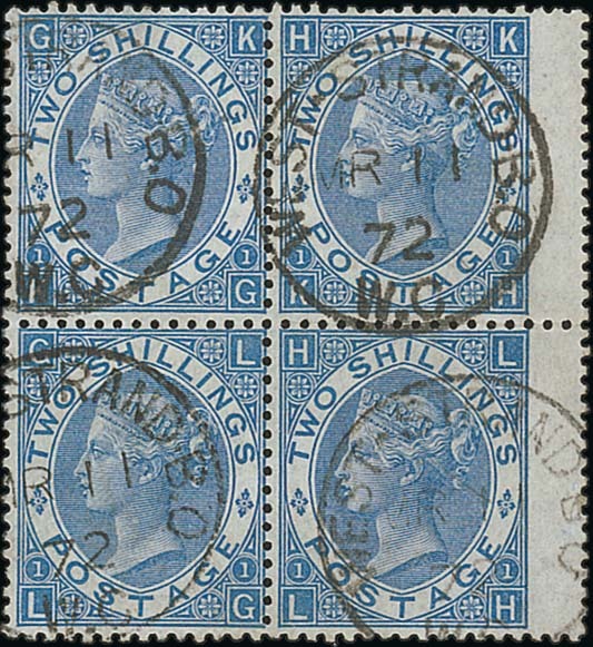 2/- dull blue Plate 1: KG-LK, block of four from the right of the sheet, each stamp neatly cancelled by a