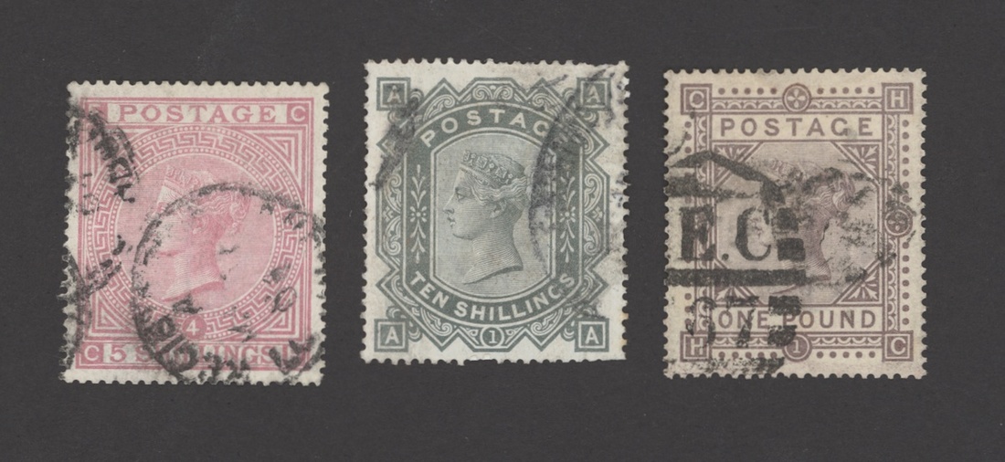 5/-, rose, Plate 4: CE, 10/- greenish grey, AA and £1 brown-lilac, HC, each used with partial indistinct datestamp; 10/- with short perfs at upper right. S.G. 134-136, £17,000. Photo