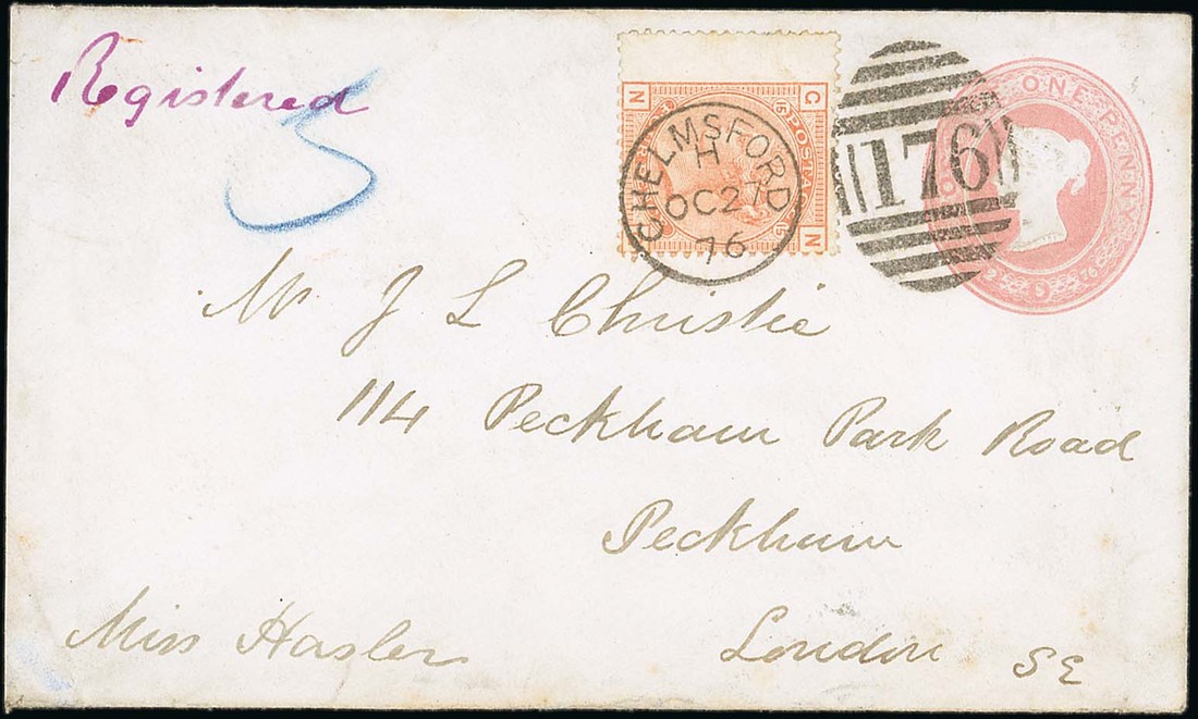 4d. vermilion, Plate 15: NC, used on 1d. pink postal stationery envelope registered to London, Chelmsford "176" duplex cancellation with a superb. c.d.s. on the stamp, arrival datestamp on reverse, fine and an exceptional cover of Exhibition quality. S.G. 152. Photo