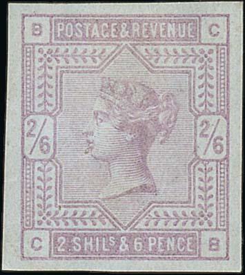 1883 2/6d. lilac, CB, imperforate imprimatur, Plate II, part original gum; small paper flaw by Queen's chin. B.P.A. Certificate (1996). S.G. 175var. Photo