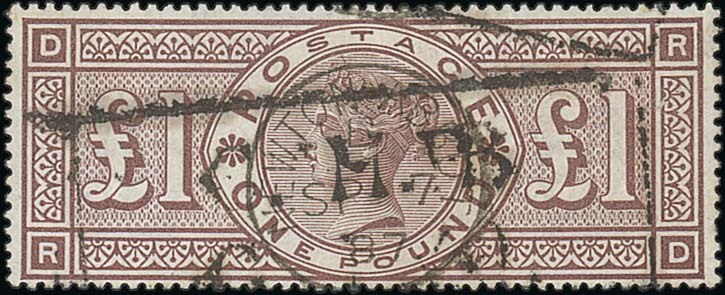£1 brown-lilac, RD, good colour, Newton Abbot and boxed cancellations, fine. S.G. 185, £3,000. Photo