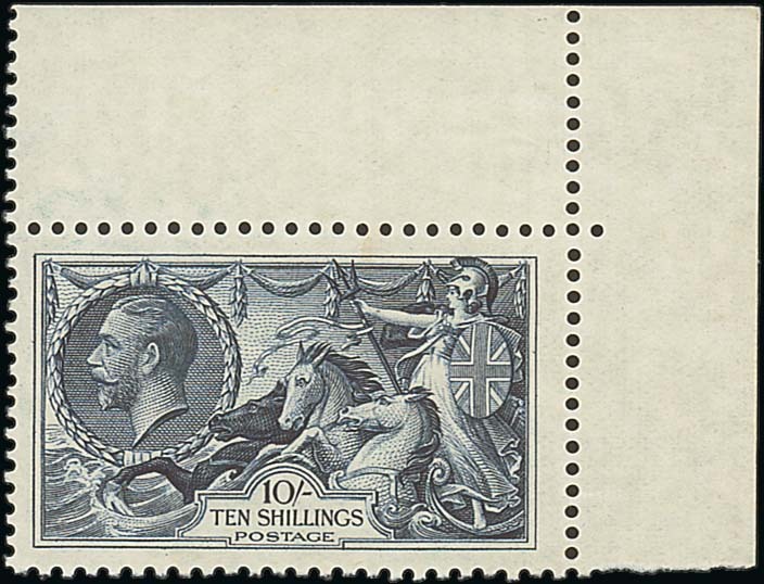 1934 re-engraved 2/6d. chocolate-brown marginal example from the lower left of the sheet and 5/- and 10/- each a marginal example from the upper right of the sheet; unmounted mint. S.G. 450-453, £1,000+. Photo