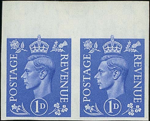 1950-52 1d. light ultramarine, imperforate horizontal pair from the top of the sheet, original gum; fine and rare. S.G. 504b, £4,800. Photo