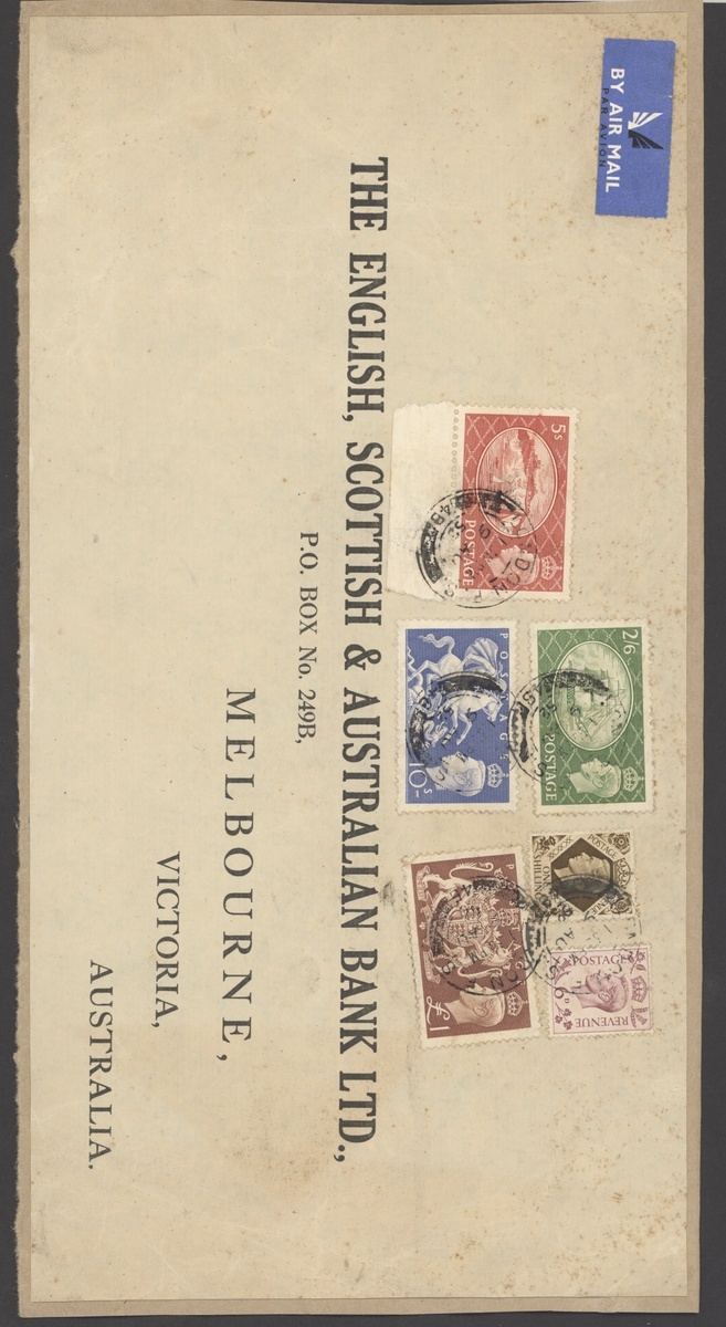 1951 2/6d., 5/-, 10/- and £1 used with 6d. and 1/- on 1953 (9 Aug.) large front from London to Australia, fine. A scarce commercial franking of 39/- (1/6d. per ½oz. x 26). Photo