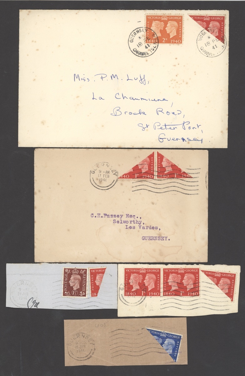1941 (17 Feb.) envelope bearing Centenary 1d. (2) cancelled with machine datestamp and 1941 (18 Feb.) envelope bearing Centenary 1d. and whole 2d. cancelled with Head Office datestamps; also pieces bearing 1937 1d. bisected vertically with 1937 1½d., Centenary 1d. (3, one bisected) and 2½d., all with machine datestamps