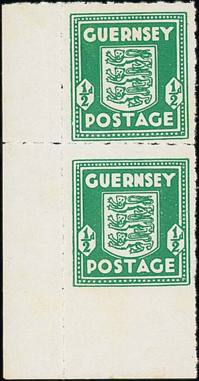 ½d. emerald-green lower left corner vertical pair, the lower stamp variety imperforate between stamp and margin, fresh mint; stamps folded between. Scarce. Photo