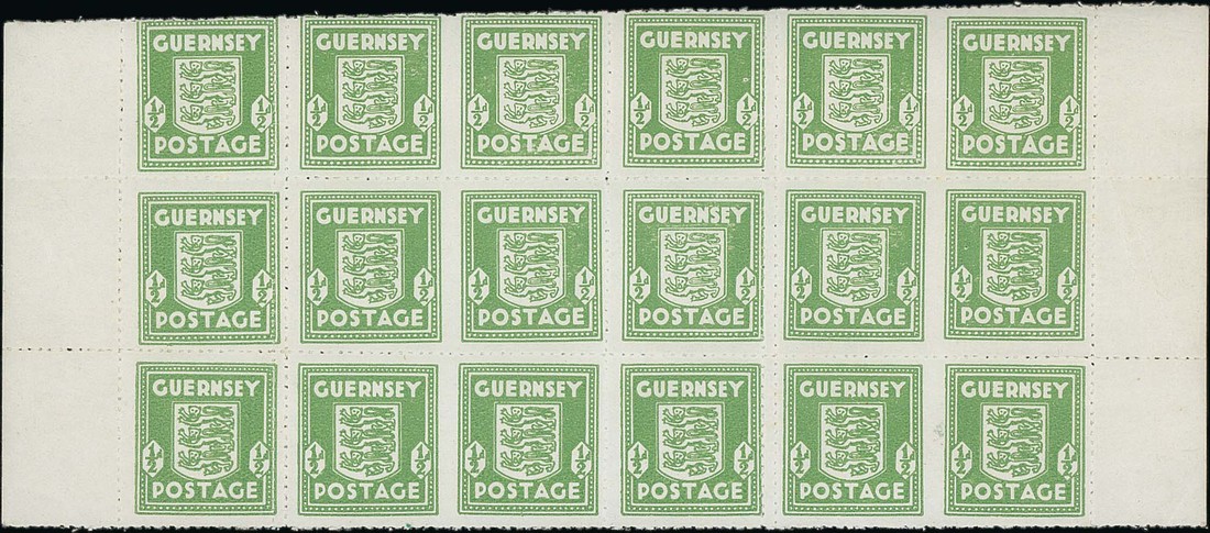 ½d. pale yellow-green block of eighteen (6x3) with margins at booth sides, columns 2 and three and 5 and 6, variety imperforate between, columns 1 and 2 and 4 and 5 with roulettes misplaced and set very close together; one variety pair with tiny adhesion, otherwise fresh and fine unmounted mint. A fine, rare and spectacular error multiple. S.G. 1h, £5,100+. Photo