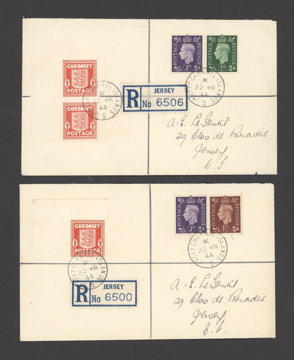 1944 (22 Mar.) Le Gentil envelopes registered from Jersey locally, one bearing 1d. red 10th. printing marginal vertical pair, the other with an upper left corner single, both variety imperforate and used with KGVI values to make up the 5½d. registration rate, all neatly cancelled with code 5 datestamps