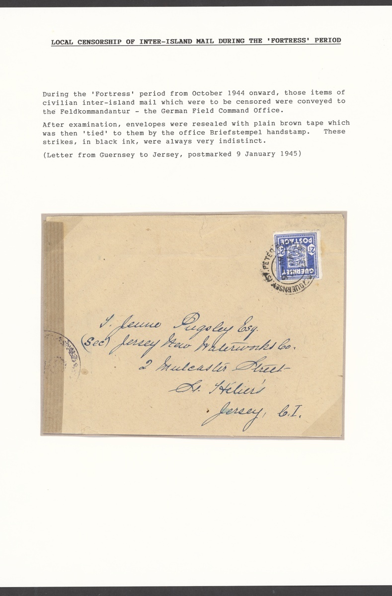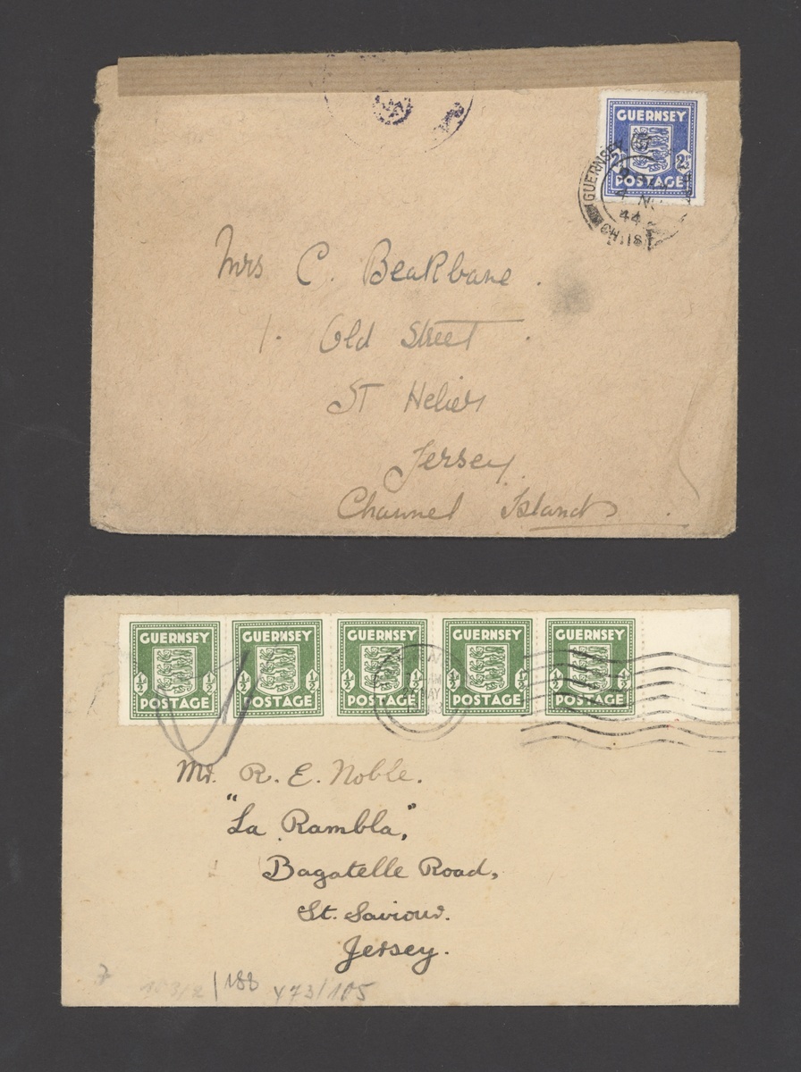 1943-44 inter-island censored mail covers (3) to Jersey, comprising 1943 (May) bearing ½d. olive (5 strip of five with German censor tape cancelled with ODW handstamp in red, 1945 (Nov.) bearing 2½d. and sealed with plain brown tape and 1945 (Jan.) bearing 2½d. and with plain brown tape tied by a part strike of the German censor. An interesting and unusual trio