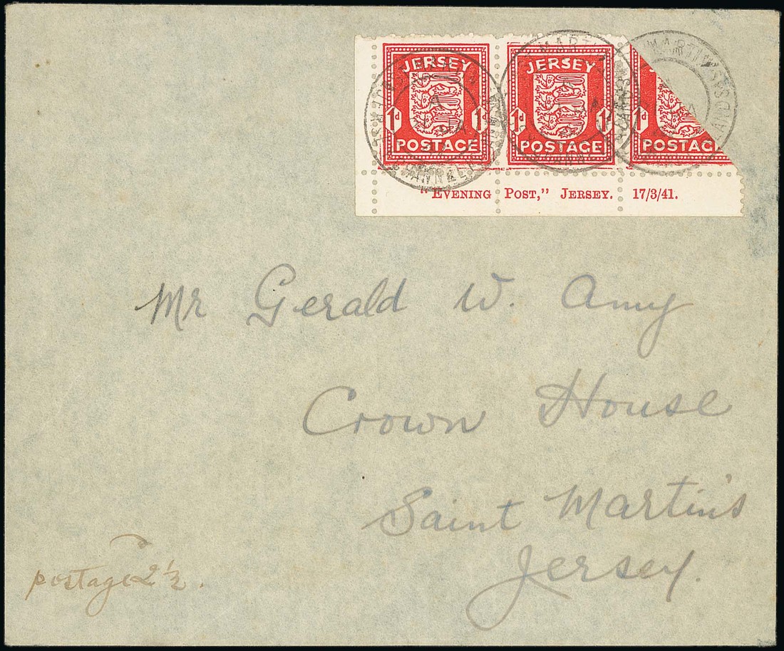 1942 (21 Jan.) envelope from St. Martin's addressed locally, bearing Arms 1d. imprint strip of three with the right-hand stamp bisected and neatly cancelled with double-ring datestamps; also two pieces with Arms 1d. strip of three, one in each bisected and cancelled with Havre De Pas or machine datestamps. Photo