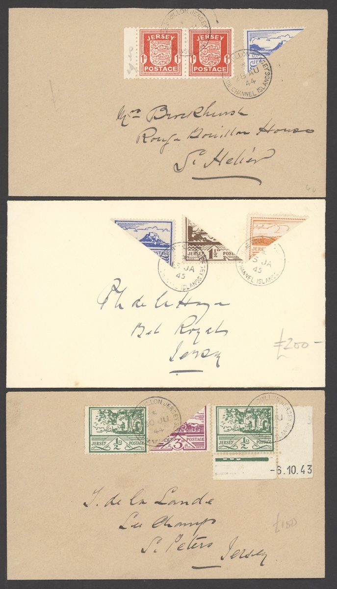 1944-45 envelopes (3) from Beresford Road addressed locally, various frankings with one bearing Views 1½d., 2d. and 2½d. each bisected, the other two with 2½d. or 3d. bisected in combination with other values, all neatly cancelled with single-ring datestamps