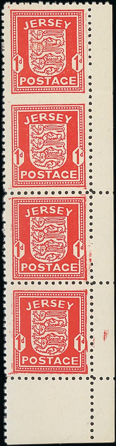 1d. scarlet lower right corner vertical strip of four, the upper pair variety imperforate between, horizontal crease at base of top variety stamp, otherwise fresh and fine unmounted mint. Scarce. S.G. 2a, £900. Photo