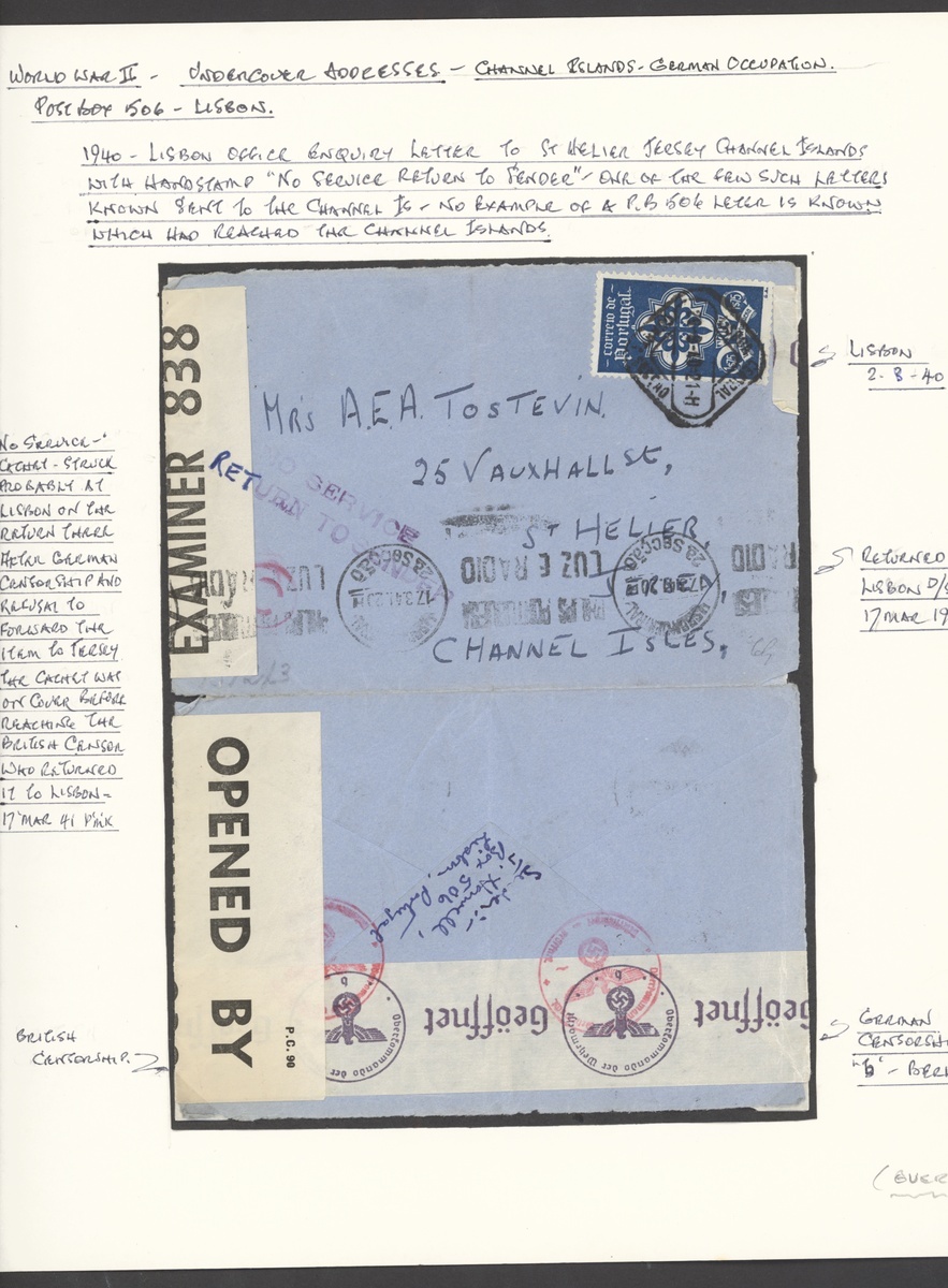 1948 (Aug.?) Lisbon Office enquiry envelope (opened-out) from Box 506 to Guernsey, showing German censor tape and ODW cachets in red, British censor tape, "