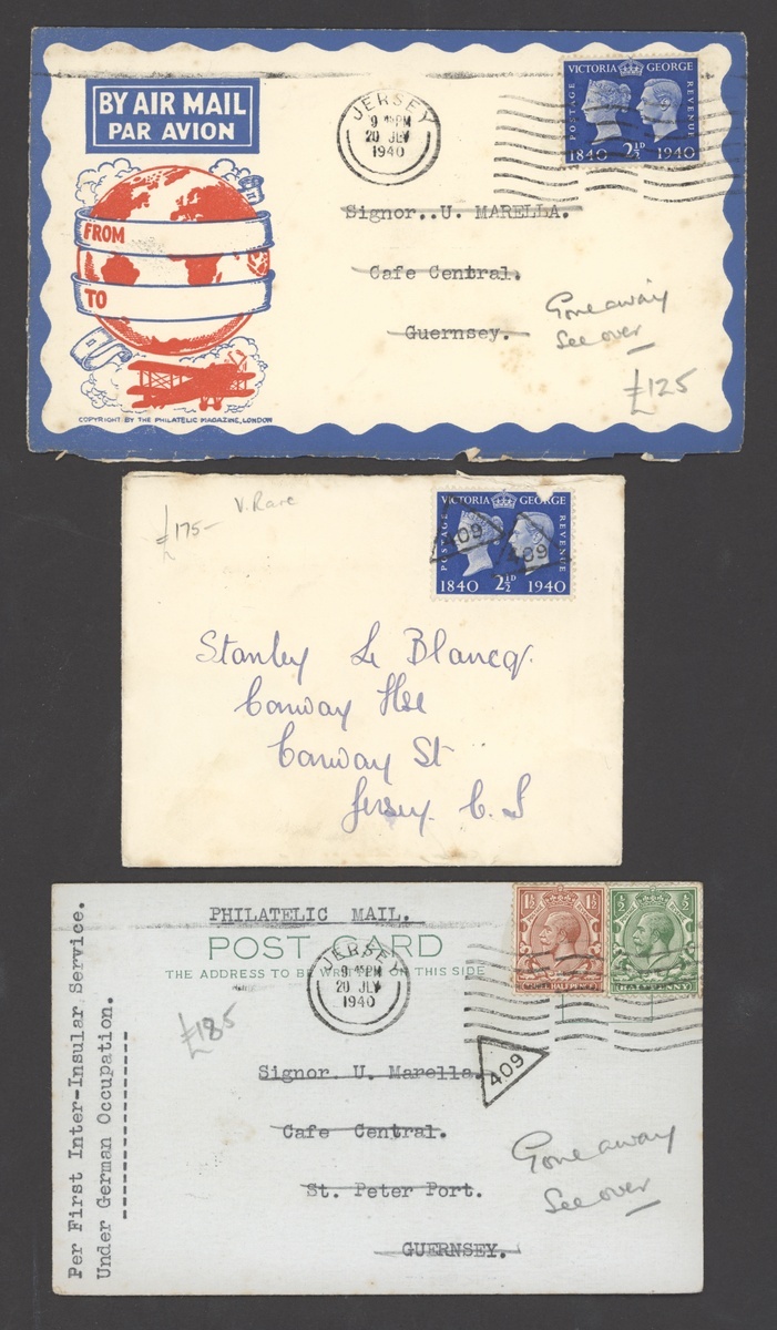 1940 (July) envelopes (3) each bearing Centenary 2½d. cancelled with small "409" bulk posting triangle, one (stamp defective) with two strikes and all with datestamps on reverse, envelope to Guernsey similarly franked and with the "409" and return Jersey datestamp both on reverse, and (20 July) postcards (2) to Guernsey, both "Philatelic Mail" with typed "Per First Inter-Insular Service. Under German Occupation.", both franked at 2d. and showing similar "409" alongside machine datestamp and manuscript "Gone away" with return Jersey datestamp for 29 July); an unusual group
