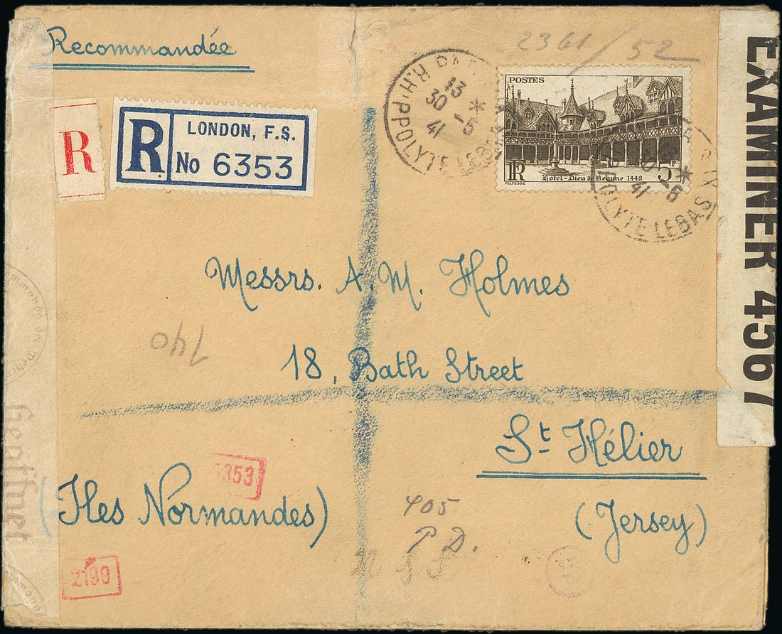 1941 (May) envelope registered from Occupied France to St. Helier bearing 5f., outgoing German censor label and ODW cachets on reverse, sent to the U.S.A. in error and with San Pedro, California (12.7) and New York (16.7) datestamps on reverse, sent back to England and with U.K. censor label and re-registered with London label, apparently forwarded via Lisbon (25.9) and again censored by the Germans. Highly unusual. Photo