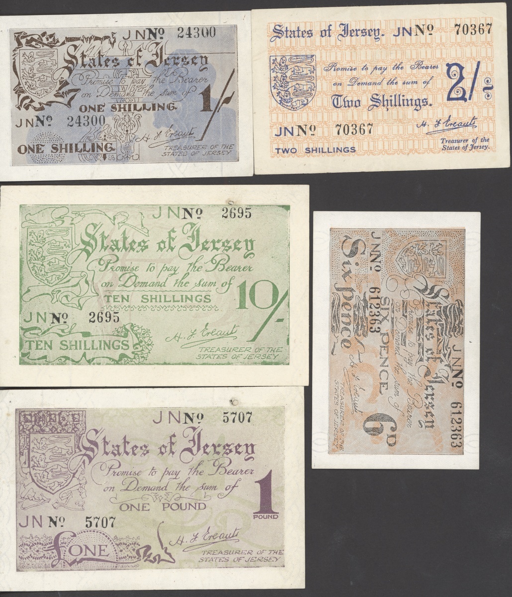 1941-42 6d. (3), 1/- (3), 2/- (1941, 2), 2/- (1942, 3), 10/- (3) and £1; the £1 with small hole at upper right just outside design, otherwise fine. Also a copy of Paper Treasure of the Channel Islands