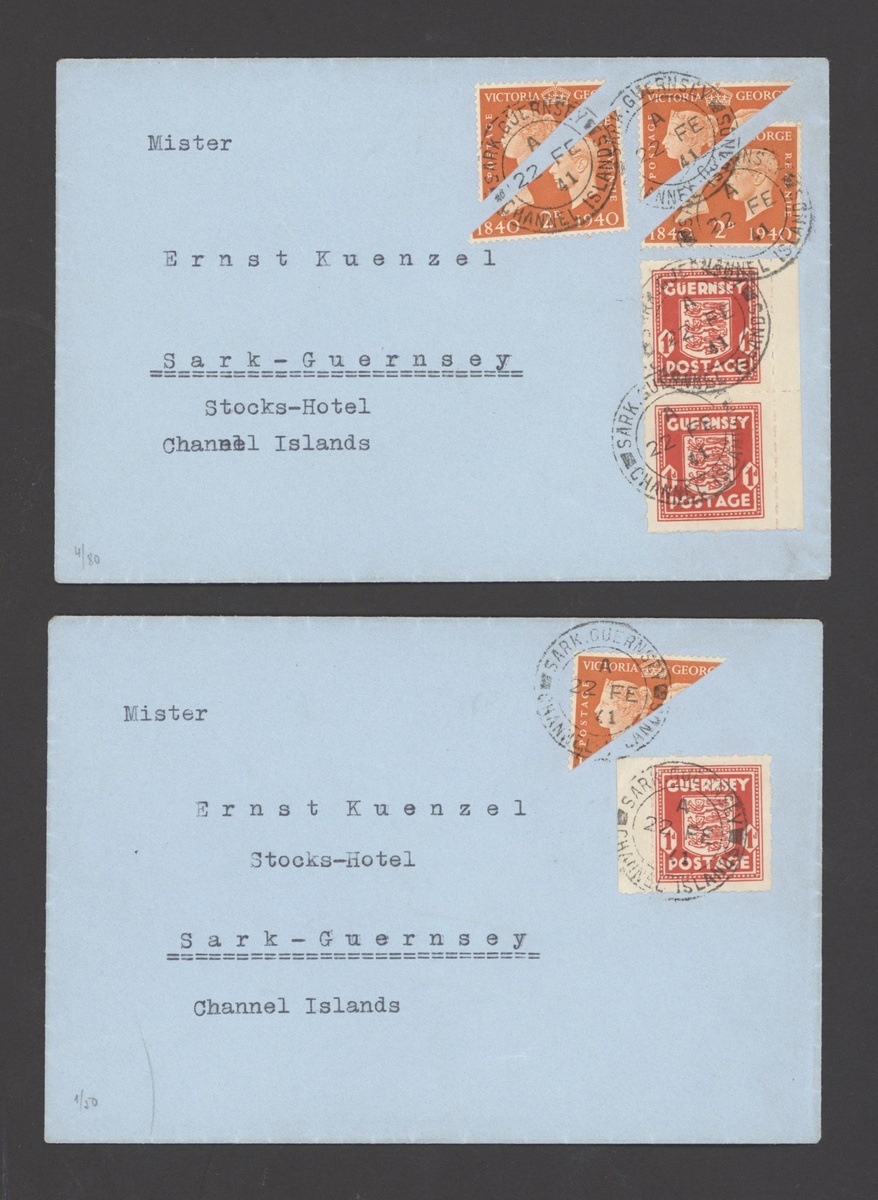 1941 (22 Feb.) envelopes addressed locally to Stocks Hotel, one bearing single Centenary 2d, in combination with Arms 1d., the other with Centenary 2d. (4) and Arms 1d. (2); an attractive pair