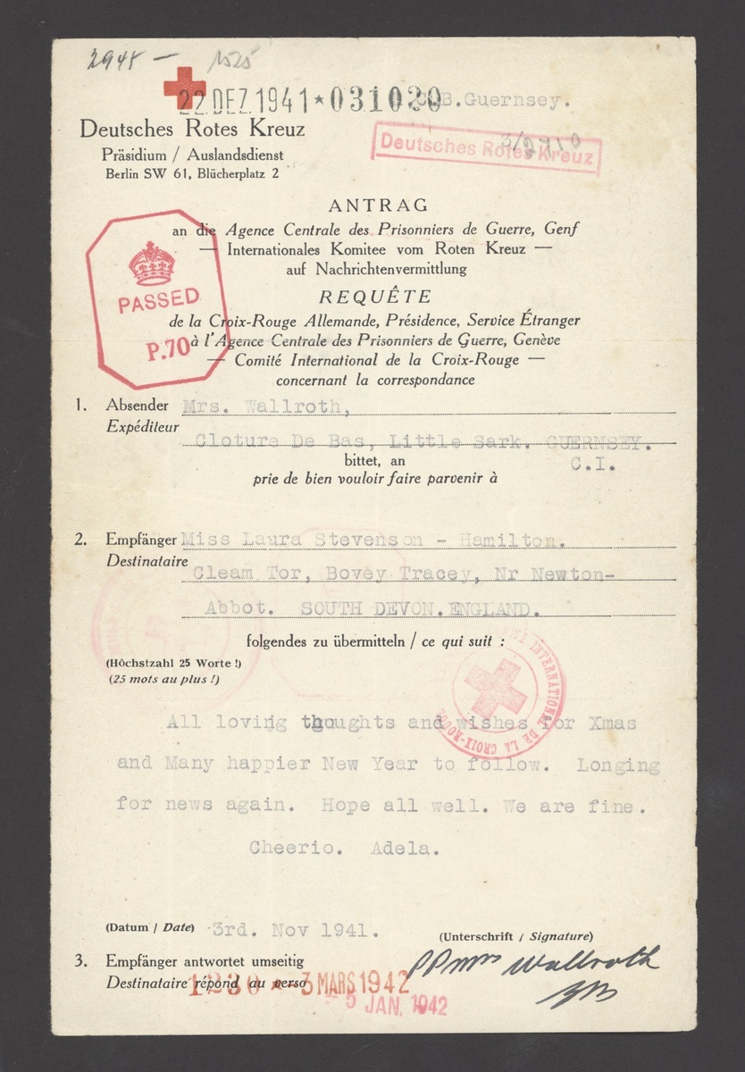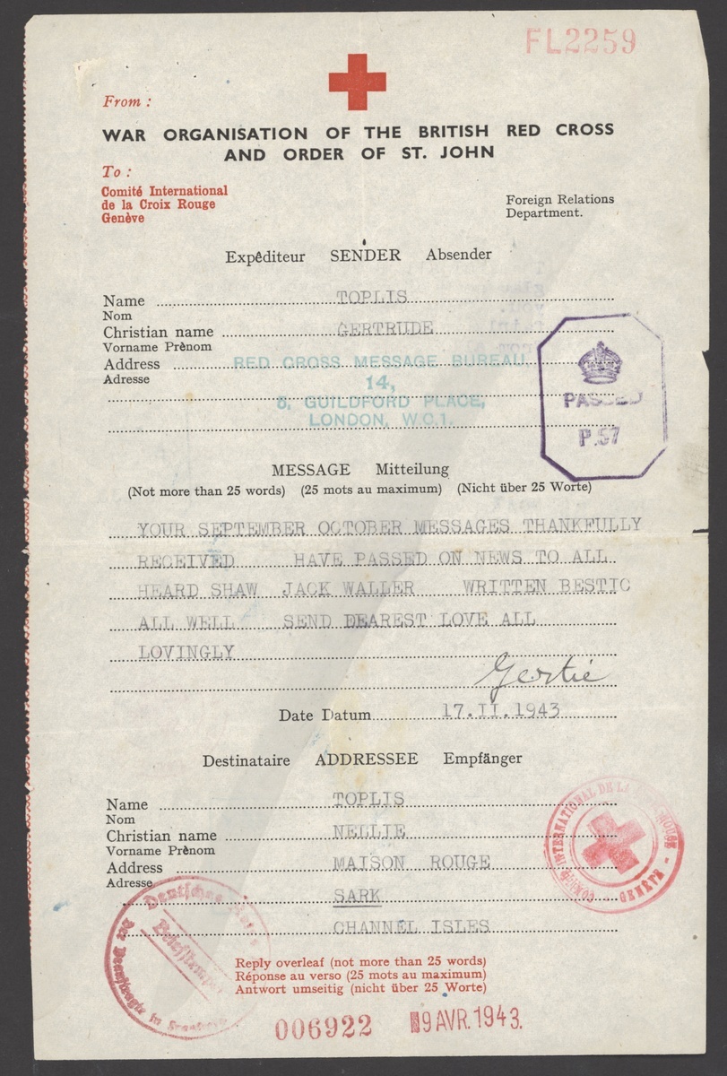 1942 German form from Mrs. Wallroth on Little Sark to Miss Laura Stevenson-Hamilton in Devon, and 1943 U.K. form from Gertrude Toplis to Nellie Toplis at Maison Rouge