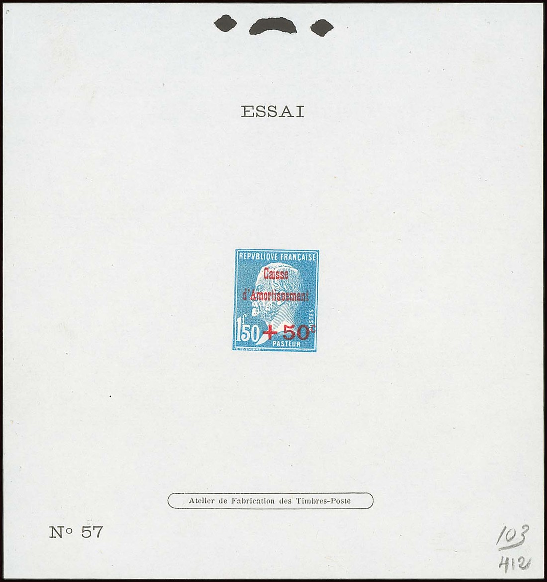 Pasteur 1f. 50 blue, surcharged "+50c" in red, Essay No 57, control perforation in margin at top, pencil notation at lower right; fine. Spink Maury €550