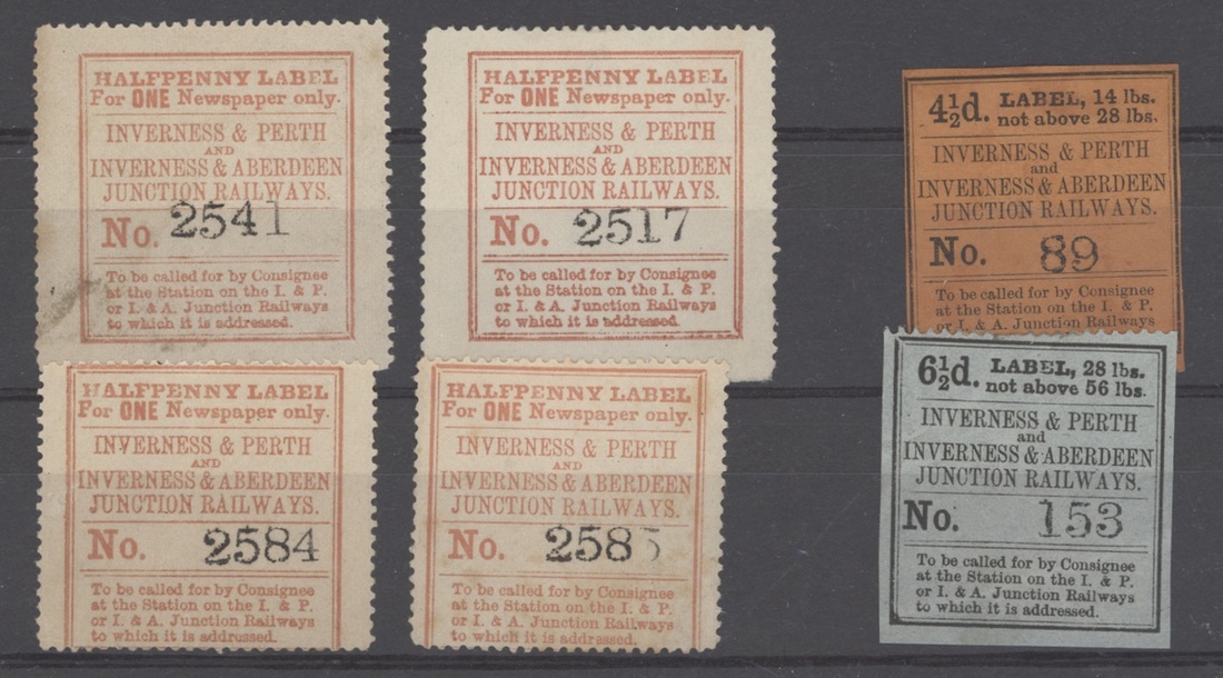 'For One Newspaper Only' label design I ½d. (4) two with large margins, two with tighter, also design II 4½d. and 6½d. all mostly small part original gum