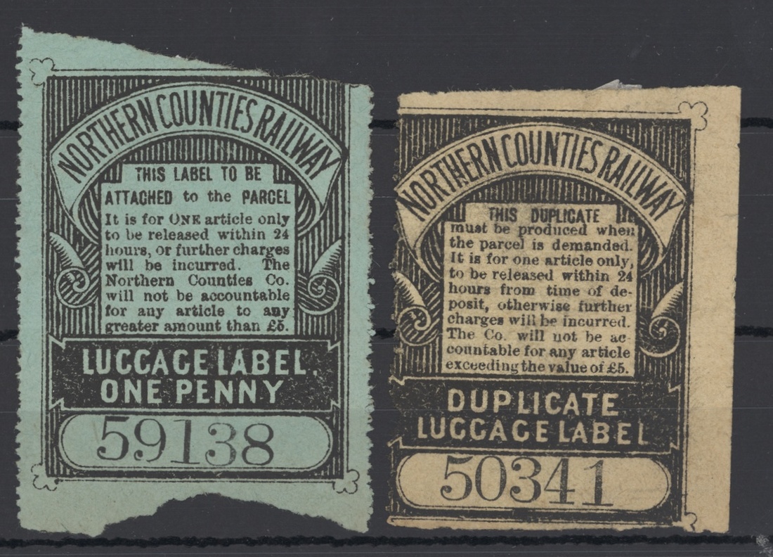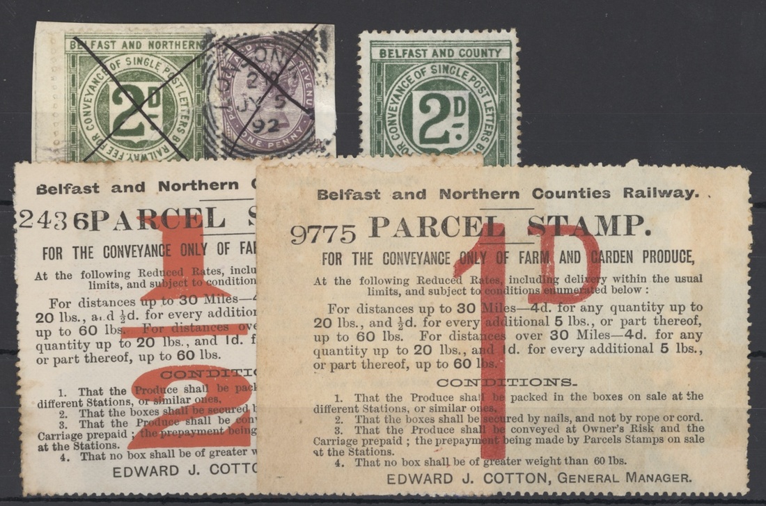 c.1891 Die I letter stamp used on piece (torn), c. 1899 2d. unused, also large format parcel stamps ½d. and 1d. unused, a little torn and soiled. Northern Counties Railway 'Luggage Label' 1d. unused and 'Duplicate Luggage Label' with denotation both torn
