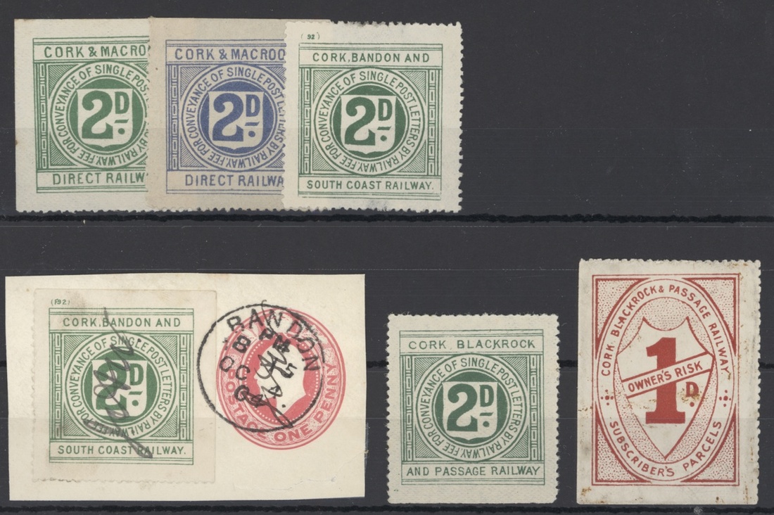 A small group including Cork & Macroom Direct letter stamps 1895 2d. violet-blue and 1898 2d. both part original gum, Cork Bandon and South Coast 1899 2d. (F92) used on piece, Cork, Blackrock & Passage letter stamp 1892 2d. part original gum with diagonal creases, also 1d. parcel unused and soiled