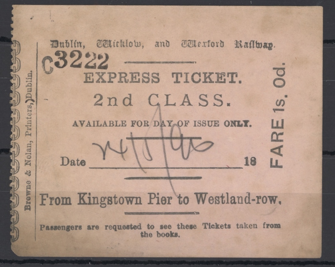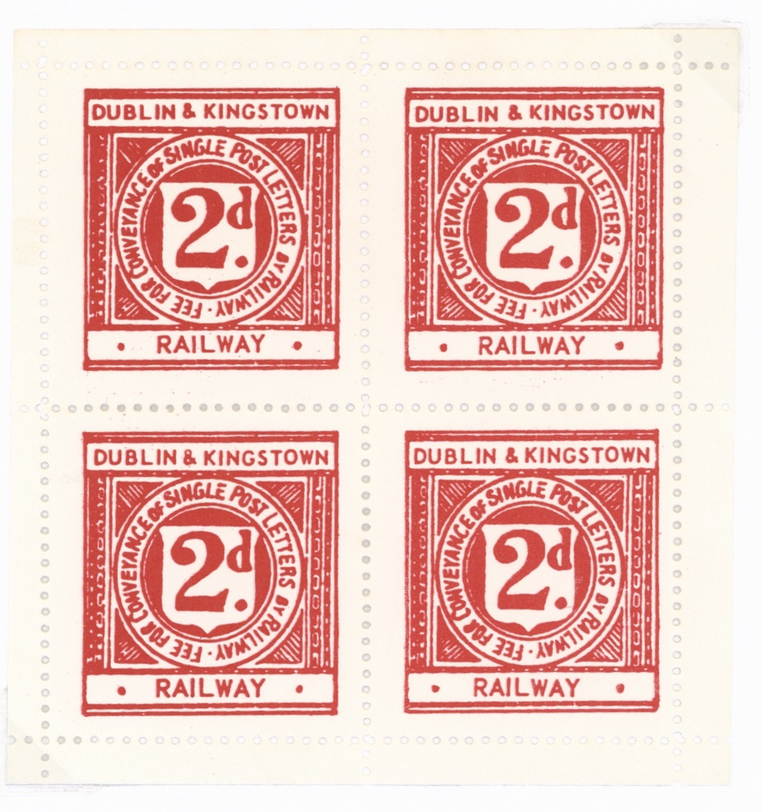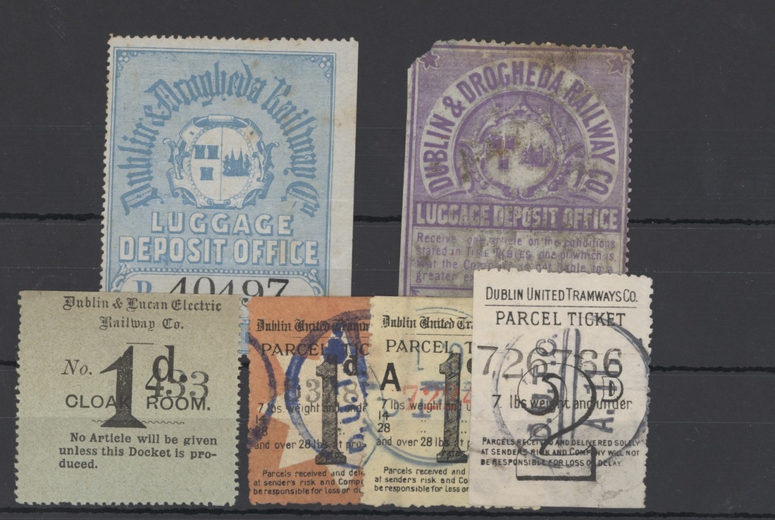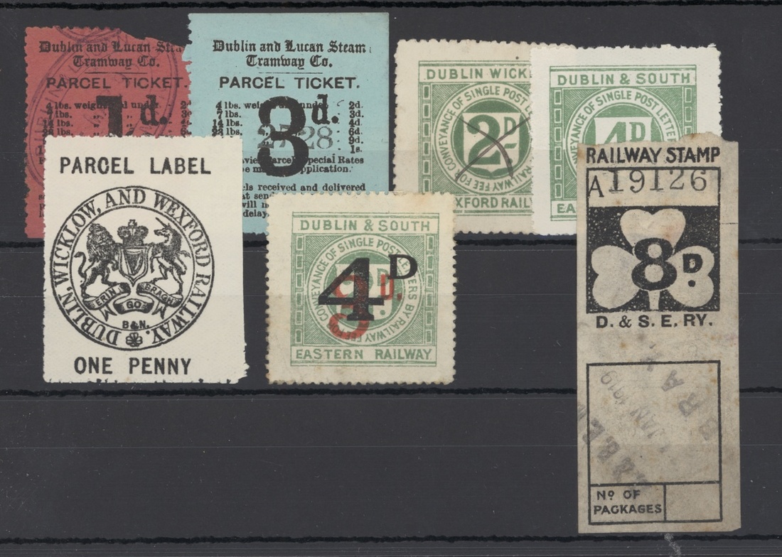 A selection including Dublin & Drogheda 'Luggage Deposit Office' 1d. blue and mauve both unused and soiled, Dublin United Tramways Co. 'Parcel Ticket' 1d. (with red border), 1d. black on yellow and 2d. black on white, all three used, also Dublin and Lucan Steam Tramway Co. 'Parcel Ticket' design I (b) 1d. torn and used and 3d. large part original gum, Dublin, Wicklow, and Wexford 'Parcel Label' 1d. large part original gum, also letter stamps (7) including Dublin & Kingstown 2d. red block of four mint and very fresh, also 2nd class ticket and compliment card