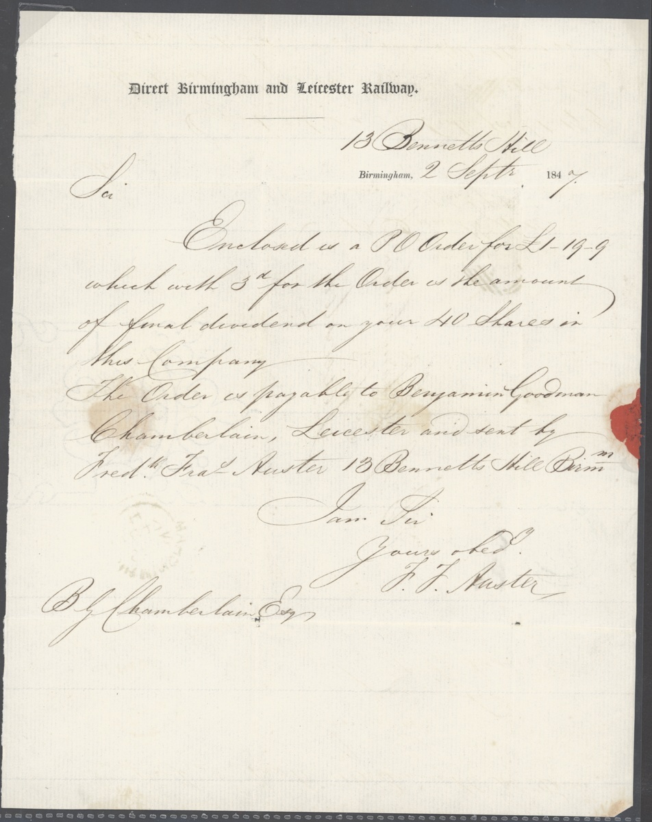 A large group of mostly Victorian entire letters with railway interest, related share status documents, reports, orders, acts and more - well over 100 items. Highlights include 1848 (1st September) entire letter to 'Manager Ayrshire Railway' bearing 2d. blue with fine strike of