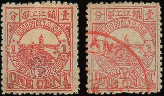 Perforated trial without clouds. 1c. rose-red with gum; there is browning at the foot of the stamp where the gum is thick (this may wash off) and an example bearing the experimental Chinkiang Postal Service c.d.s. in red; this stamp has a light crease and some similar gum browning at the foot of the stamp. Photo