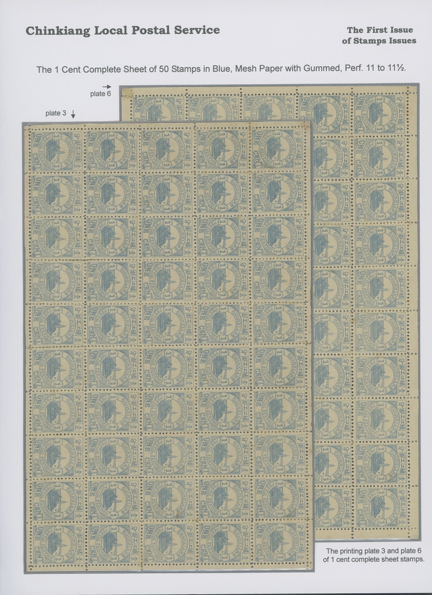 1c. blue in complete sheet of fifty, thought to be plates 3 and 6, large part original gum. (100)