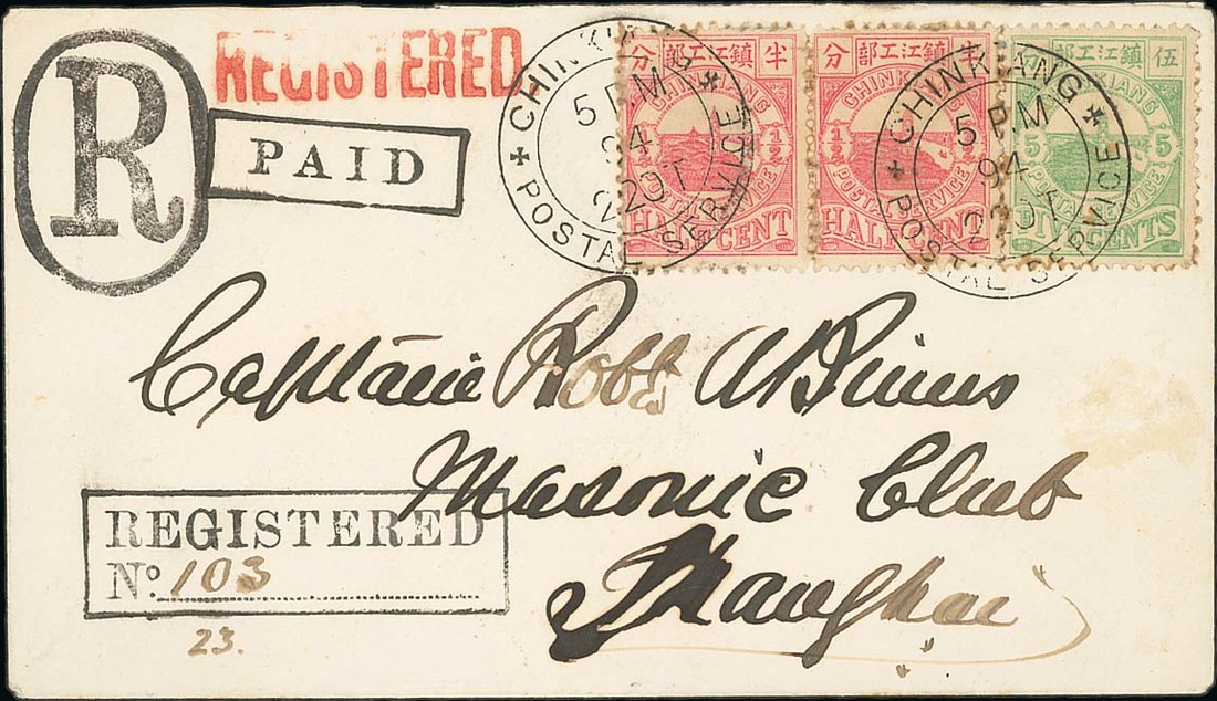 1894 (22 Oct.) Capt. Binns envelope registered to Shanghai bearing ½c. (2) and 5c. tied by fine strikes of the small, 29mm Chinkiang Postal Service c.d.s. with superb strike of the boxed "PAID" and boxed registered handstamp with manuscript number "103" and the two Capt. Binns private registration handstamps, the reverse with further despatch c.d.s., the double-circle bilingual postmark and Shanghai Local Post arrival (23.10) in blue. Fine. Photo