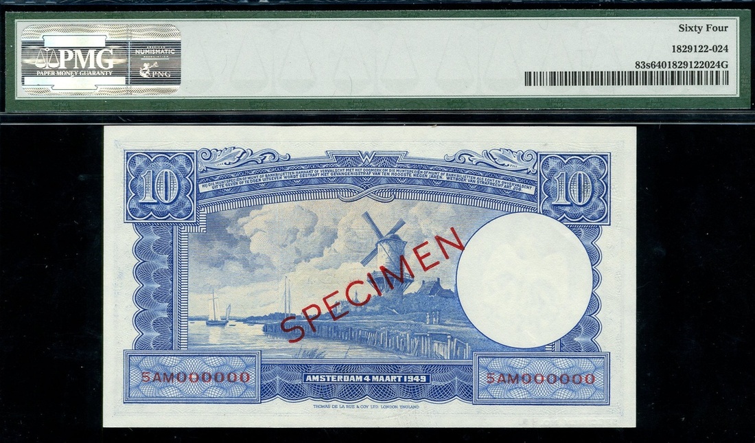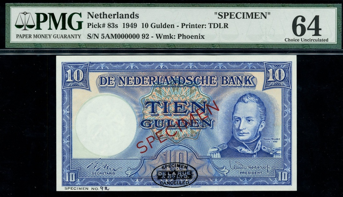 De Nederlandsche Bank, specimen 10 Gulden, 4 March 1949, zero serial number, (Pick 83s), in PMG holder 64 Choice Uncirculated