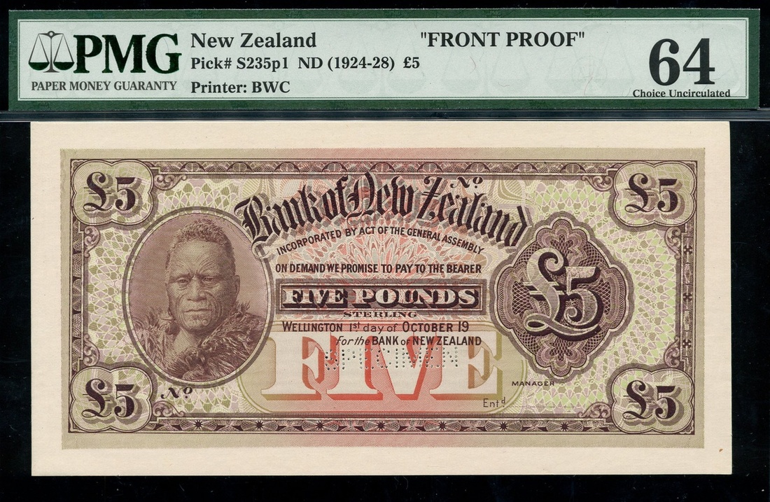 Bank of New Zealand, an obverse uniface proof £5, Wellington, 1 October 19- (1924), purple, pale green and pale pink and lilac, the Maori King Tawhiao at left, value at right