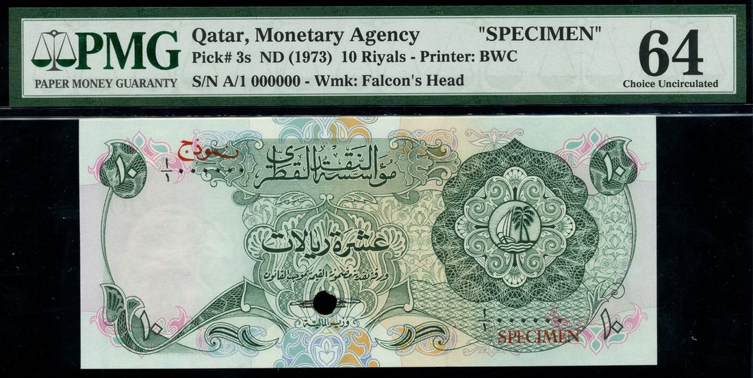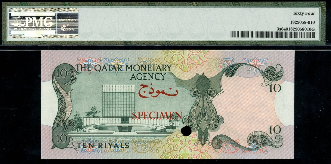 (x) Qatar Monetary Agency, specimen 10 riyals, ND (1973-79), serial number 000000, green, arms at left, signature Abdulaziz al-Thani, reverse, Qatar Monetary Agency headquarters building