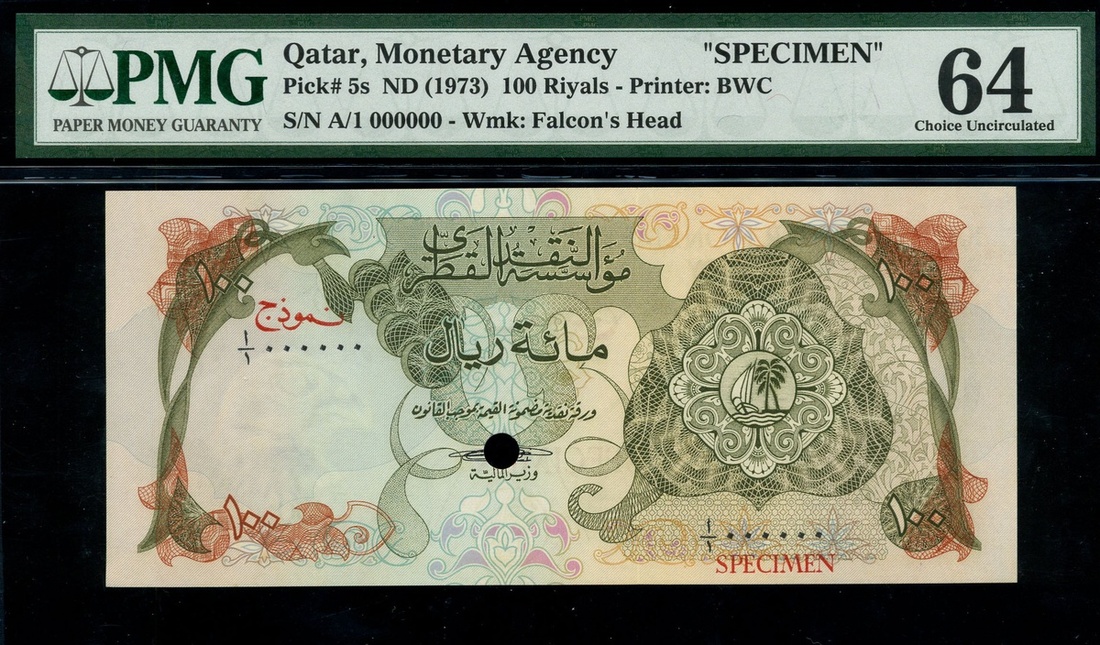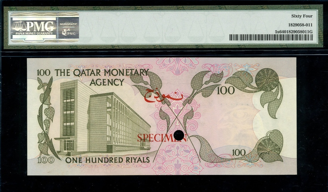 (x) Qatar Monetary Agency, specimen 100 riyals, ND (1973-79), serial number 000000, olive green, arms at left, signature Abdulaziz al-Thani, reverse, Ministry of Finance building,