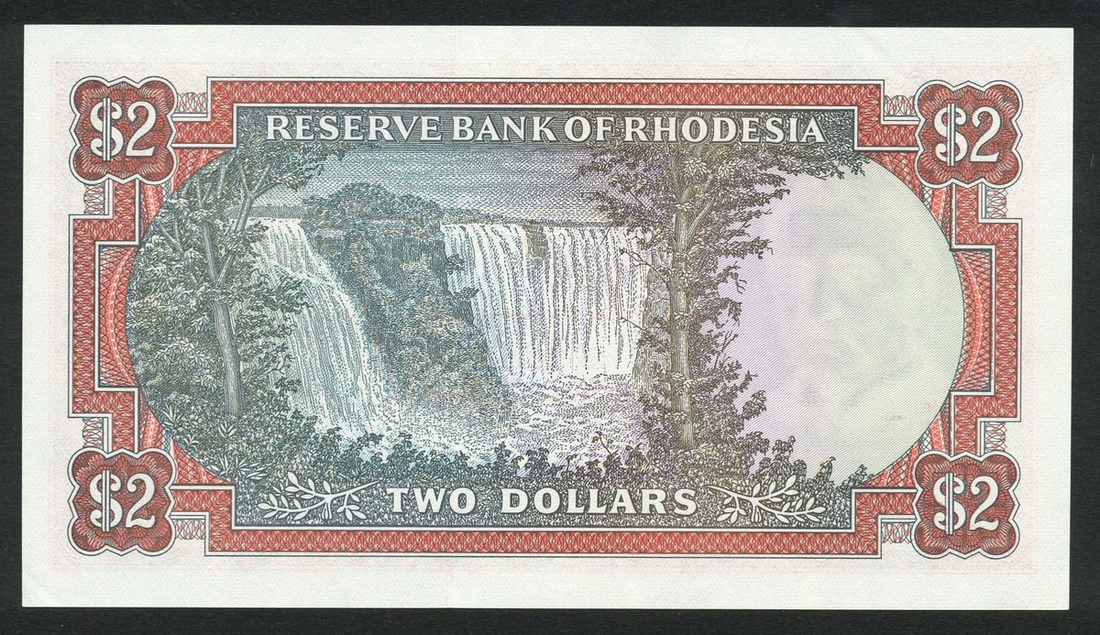 Reserve Bank of Rhodesia, $2, 1979, serial number K/149 377374, red on pale violet and light brown, bank title top centre, arms at right, value top left, right, low right and centre, flowers low left, reverse, Victoria Falls,
