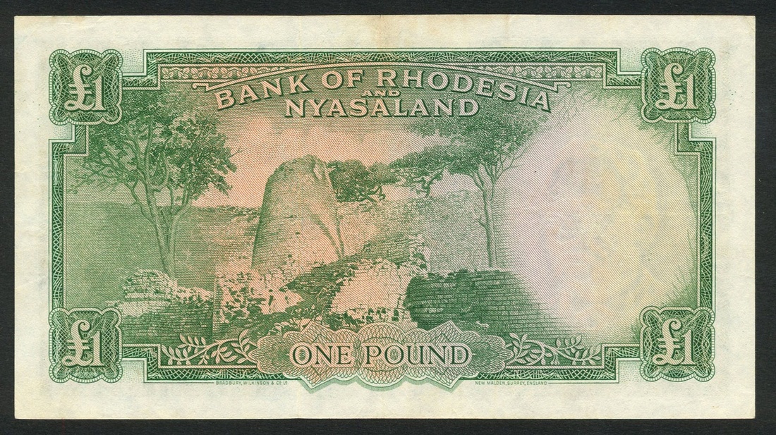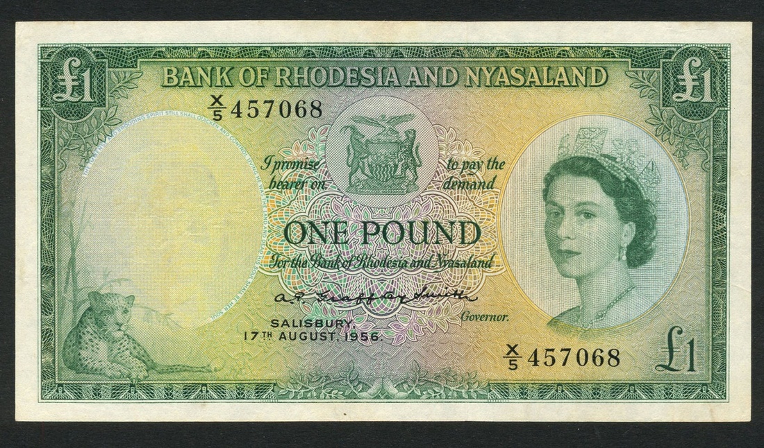 (x) Bank of Rhodesia and Nyasaland, £1, 17th August 1956, X/5 457068, green on multicolour underprint with portrait of Elizabeth II at right, arms and centre and leopard lower-left, reverse scene of ruined building and value at corners,