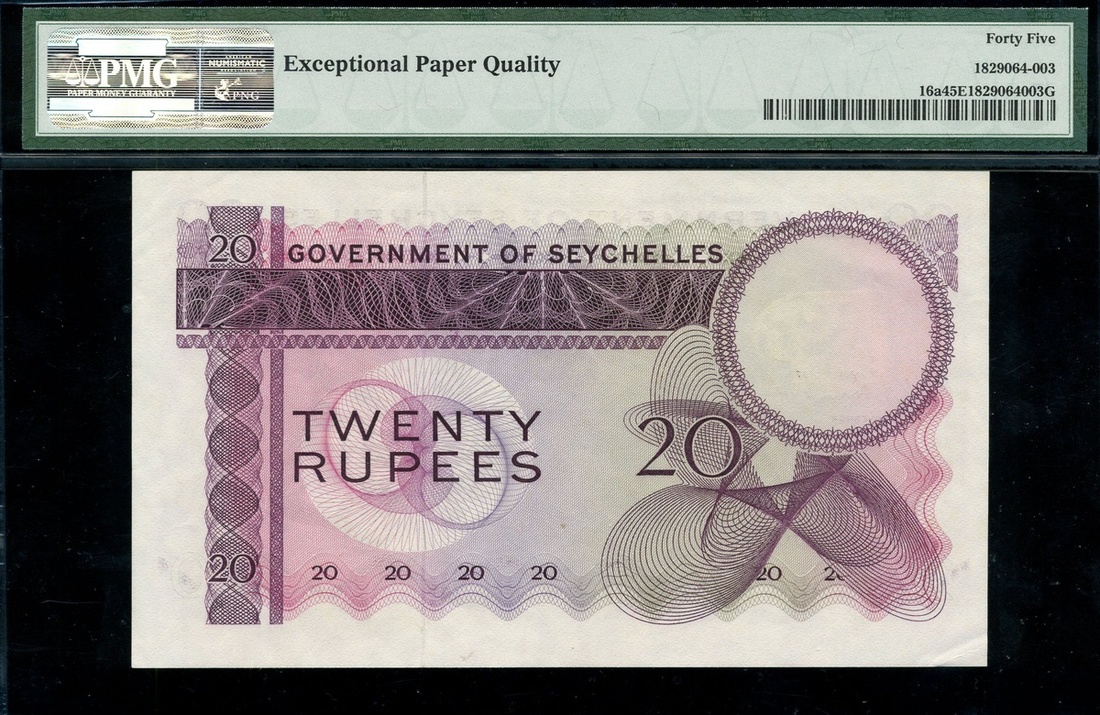 Government of Seychelles, 20 rupees, 1st January 1968, first issue, serial number A/1 000079 mauve and pink, Sooty tern, Skink lizard and coral and shells, Elizabeth II at right, signature of Hugh Selby Norman-Walker, reverse geometric patterns