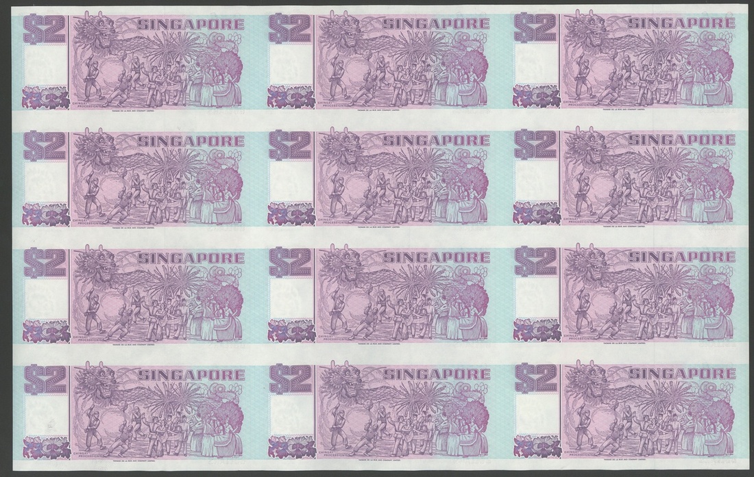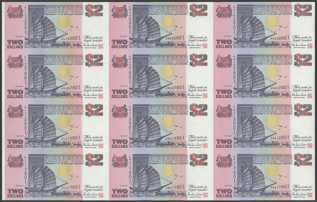 Singapore, Board of Commissioners of Currency, an uncut sheet of $2 (12), prefixes KL, KM, KN, (Pick 28), in original presentation tube, uncirculated (12)