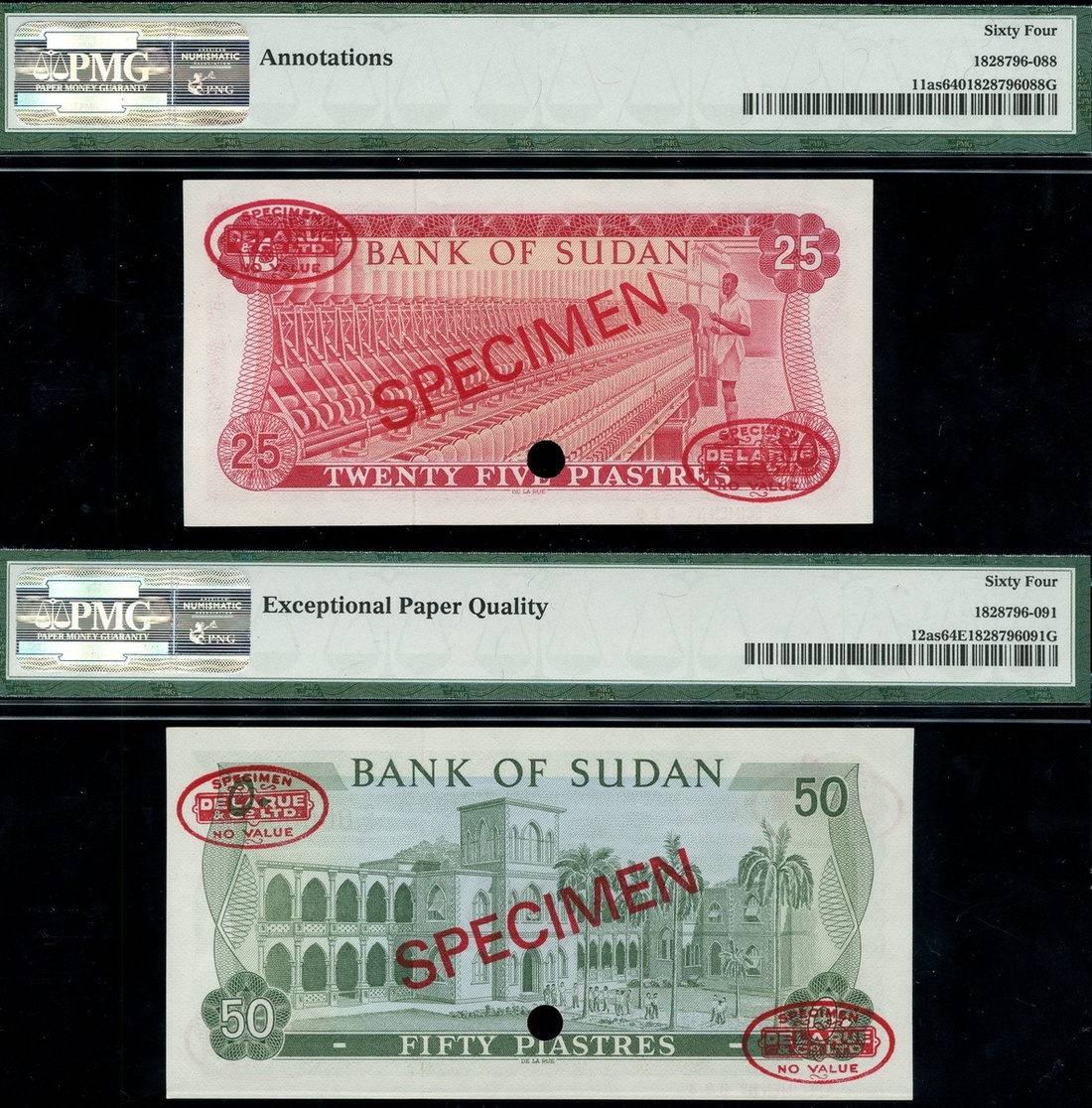 Bank of Sudan, Specimen 50 Piastres, 1970, specimen number B/00 0000000 093, Specimen 25 Piastres, 1970, specimen number A/00 0000000 019,