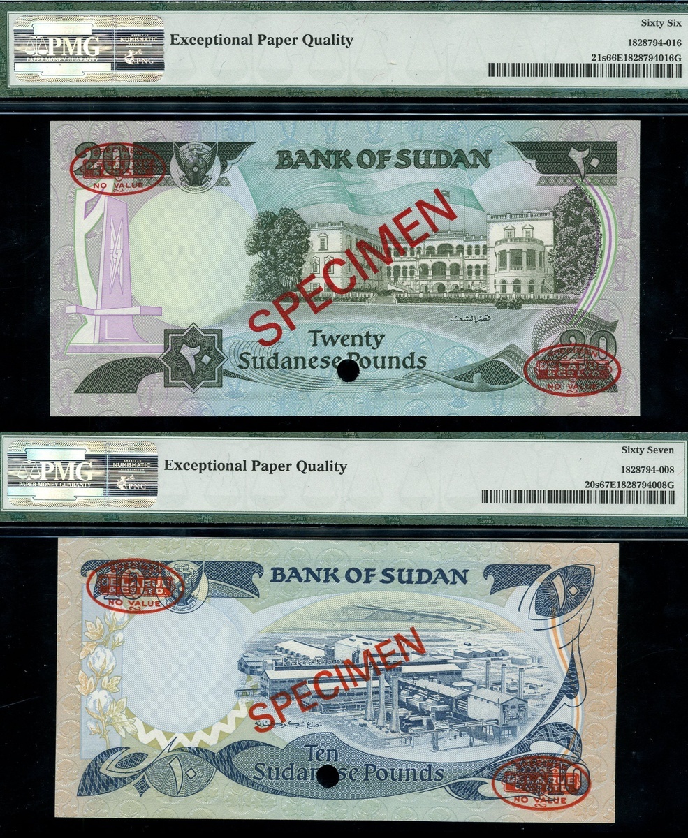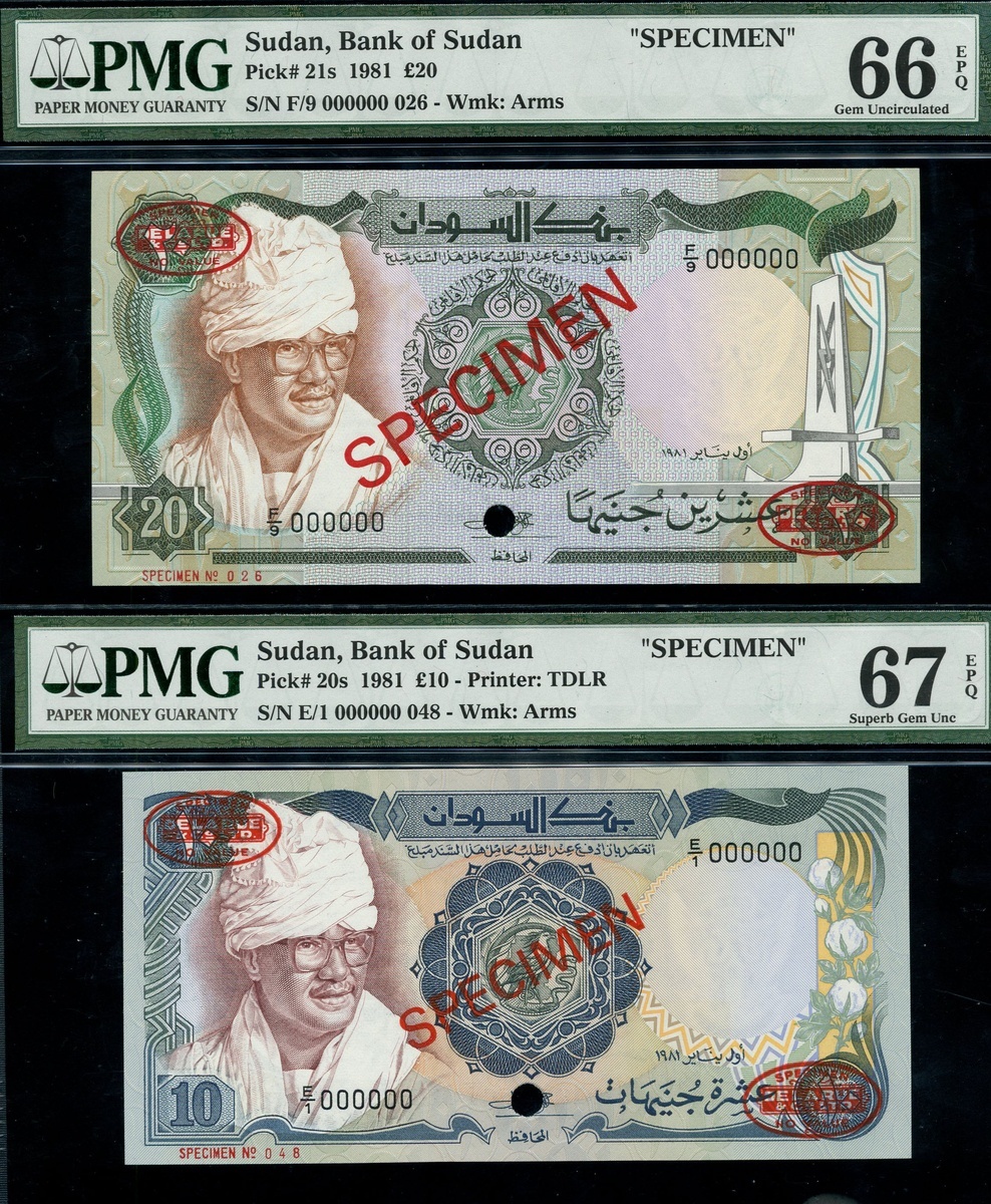 Bank of Sudan, Specimen £20, 1981, specimen number F/9 000000 026, Specimen £10, 1981, specimen number E/1 000000 048,
